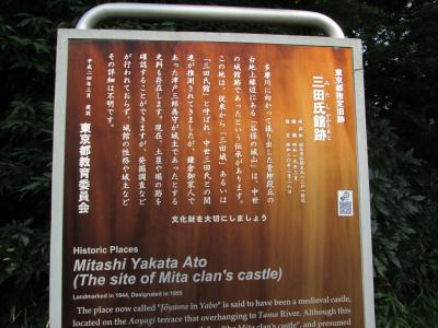 三田館は築城主、築城年は不詳。現在国立市の城山公園として整備され いますが、一方鎌倉御家人の津戸三郎為守の館ともいわれています。公園の東側から入ると、右手に土塁、その足元に水堀(細い用水)があります、やがて空堀と土塁、三田氏館跡の説明板井戸跡が見えてきます。幾つかの遺構を見ることが出来る、お城ファンには見逃せない城跡です。現在も三田城跡には三田氏子孫の邸宅があり、私有地になっている場所には入れません。邸宅入口には添付写真の標識が立てられていますので、気をつけましょう