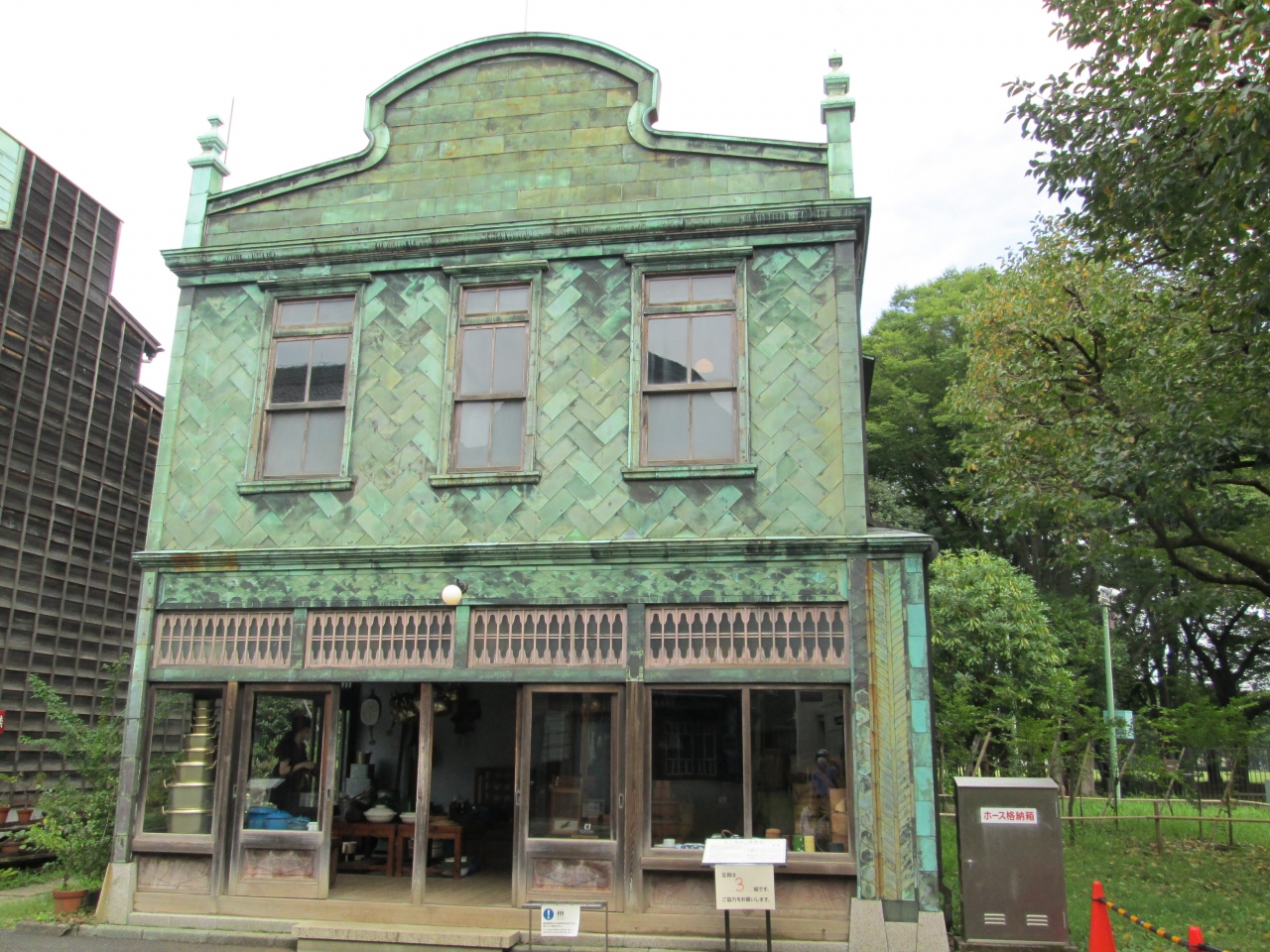 大和屋本店は江戸東京たてもの園の中にあります。昭和3年港区白金台に建てられた店舗兼住宅で乾物類を商っていました。たばこも販売していたので、煙草屋も取り付けられています。看板建築の特徴を備えたユニークな建物です。看板建築とは建物前面に庇の無い平坦な造りになっている。元々日本の商店は二階より一階の軒先が出ている建屋が多かったのですが、関東大震災後規則に寄り、建屋が道路にはみ出さないように定められたため、有効利用ということで、前面が垂直に立ち上がった看板建築といわれる建屋が多く見かけられるようになる。関東大震災後の看板建築の特徴は前面にタイル張りまたは銅板張りが多く、終戦後は銅板には耐火性が無いということで、モルタル張りが主流となったそうです。私が子供のころ終戦後住んでいた周りで、銅板、タイル張りの看板建築を見たことが無い理由が理解できました