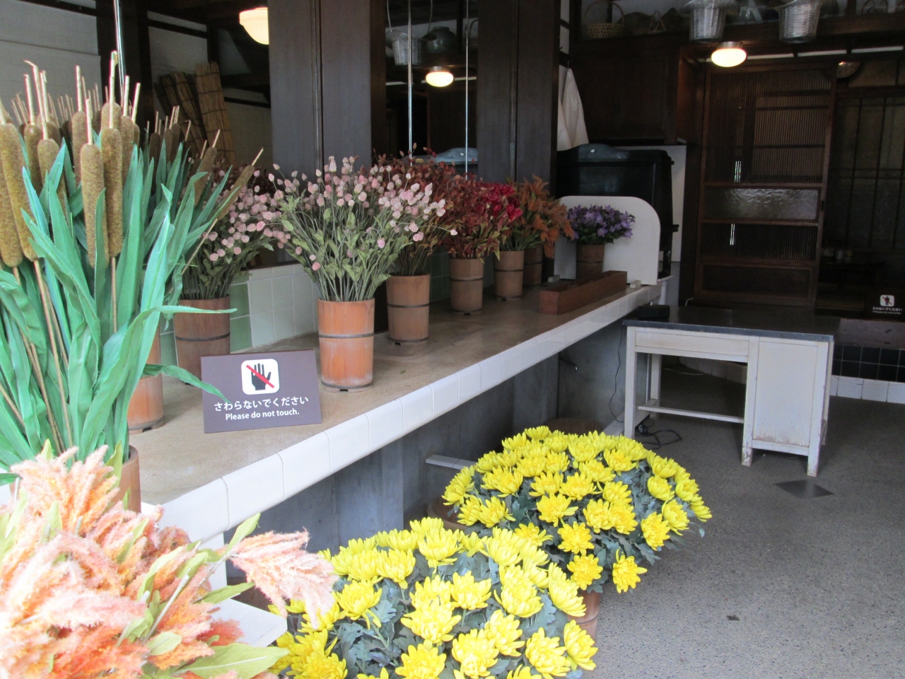 花市生花店は江戸東京たてもの園の中にあります。昭和2年に神田淡路町に建てられた店舗兼住宅です。この建物も全面を平坦にした看板建築です。1991年まで生花店を営んでおりました。花が店に展示されています。注目するのは、二階窓の下と三階前面四隅ある銅板に梅、桜、牡丹、菊、蝶が描かれています。木彫の上に銅板を置き、木槌を使って打ち出させて作ったもので、職人の技を見ました。大変凝った看板建築です