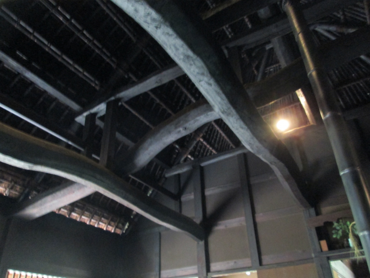 綱島家は江戸東京たてもの園の中にあります。世田谷岡本に江戸時代中期に建てられた農業古民家です。茅葺屋根を持ち、床の間付きの座敷があるところからも豪農のように思えます。しかし他の天明家や吉野家にある式台や玄関が備わっていないところから、格式はあまり高くない農家だと推測されます。上は天井が無く、そこに張られている梁は自然の形状を残したまま使用されており、素朴で気に入りました