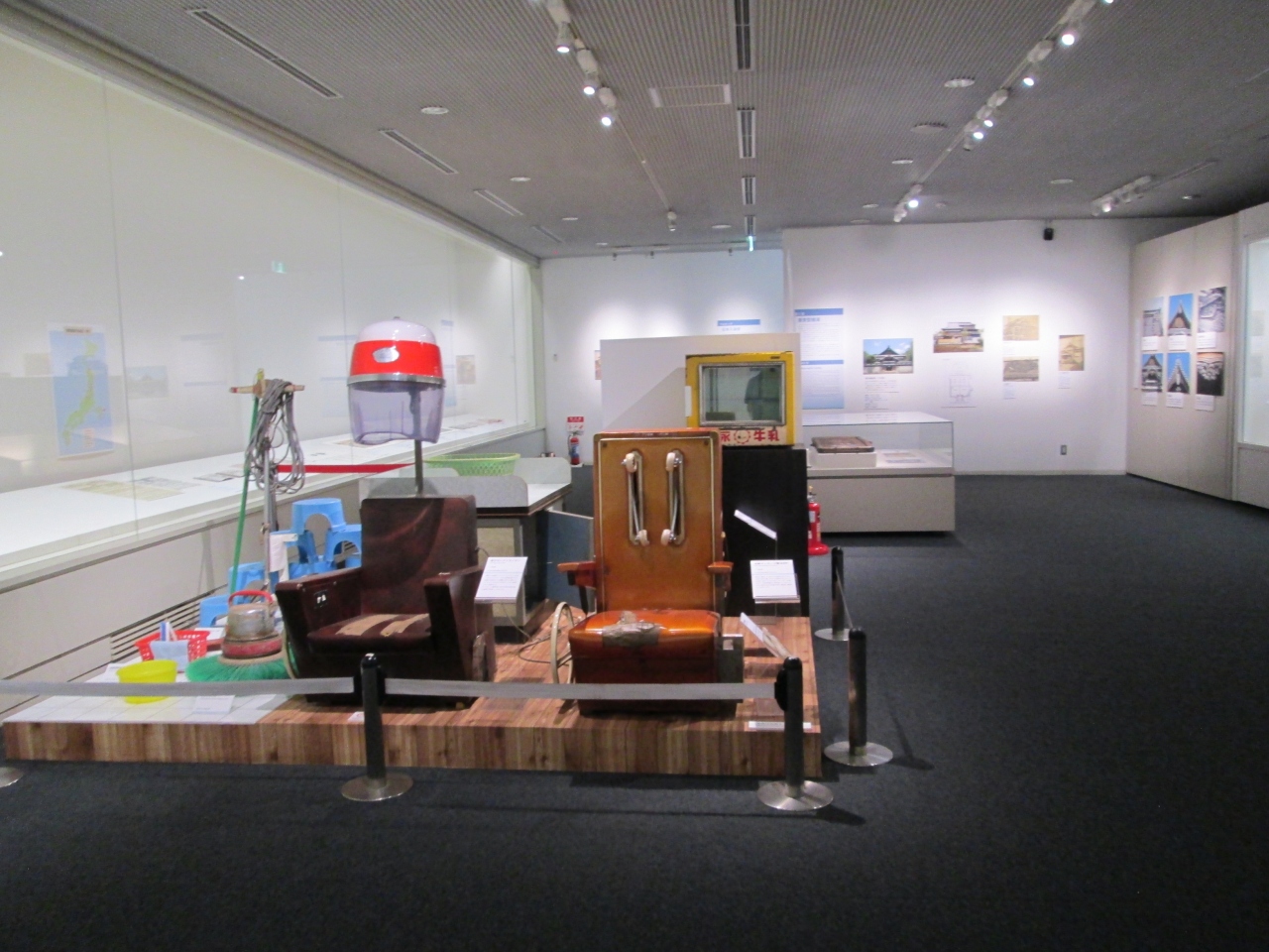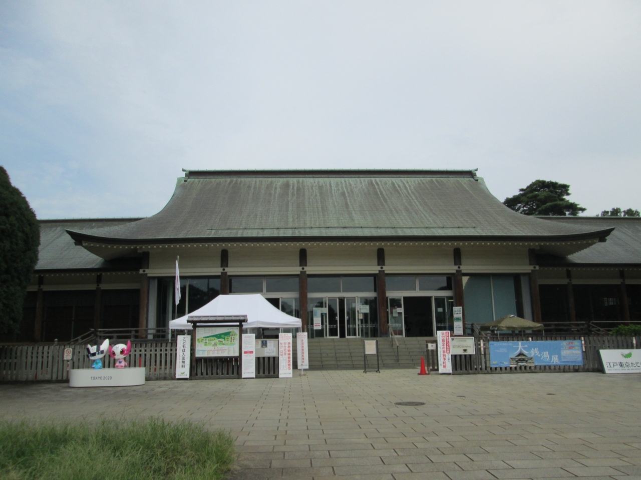 ビジターセンターは江戸東京たてもの園の入口(受付)にあります。1940年に開催された紀元2600年記念の式典のために建設された式殿(旧光華殿)で、現在江戸東京たてもの園の入口施設になっています。宮殿を想像させる外観です。施設の中にはミュージアムショップ、カフェ、図書コーナー、多目的ホールがあります。多目的ホールでは銭湯展が開催され、銭湯の一日、歴史、銭湯の備品等が写真を含めて展示されていました。私が現在住んでいるところには、銭湯は一軒のみとなっています。昔は3~4家軒あったのですが、時代でしょうか。貴重な銭湯です