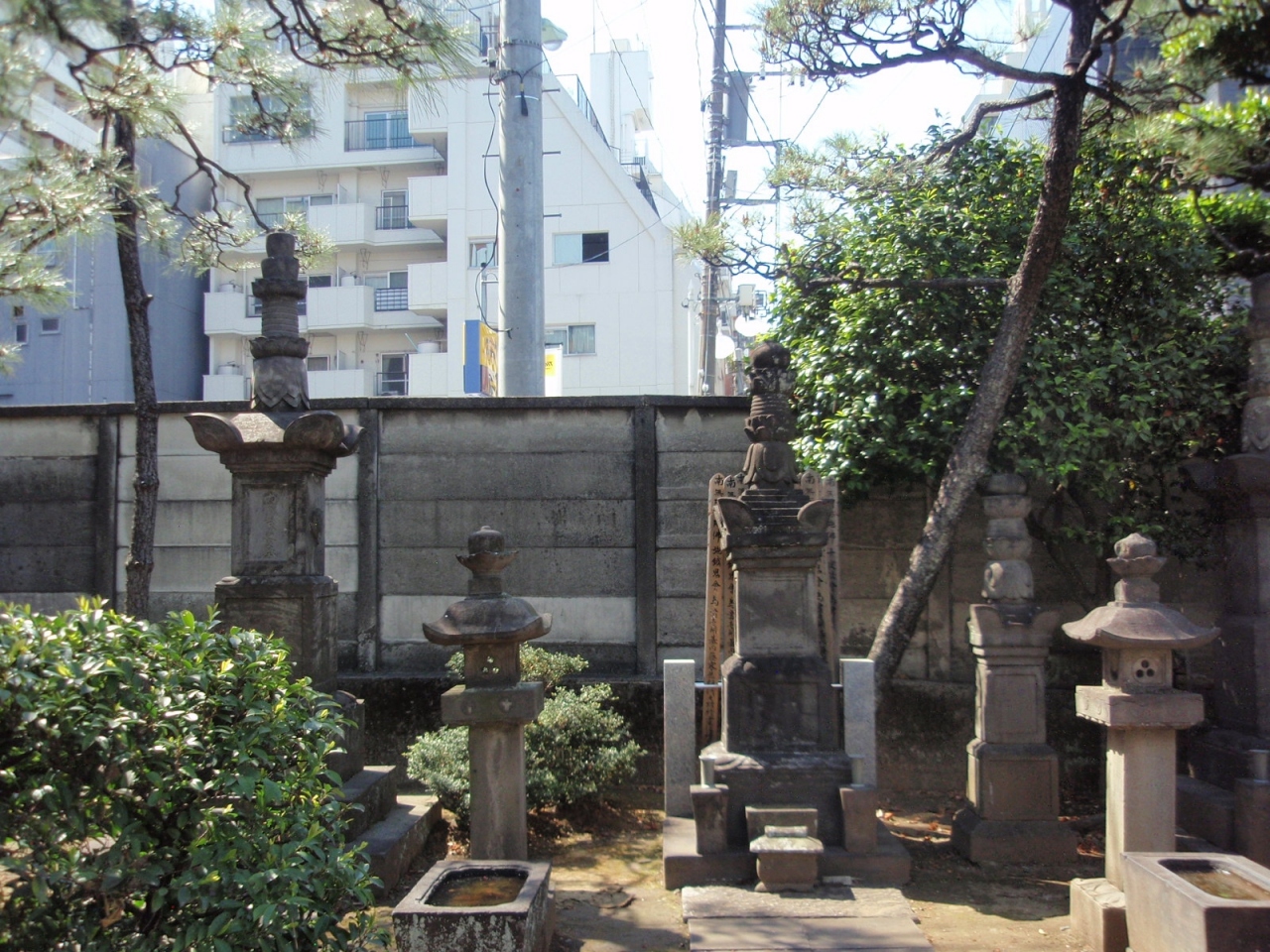 浄土宗の一寺、創建は1668年、開山は太宗和尚、本尊は阿弥陀如来像です。門を入ると左手に稲荷社、塩掛け地蔵尊、三日月不動と新宿山の手七福神の布袋尊が安置されている不動堂、墓所の一番奥に内藤正勝等の墓群、正面に超近代的な本堂、その右手が客殿、右手に焔魔堂と銅像地蔵菩薩像があります。内藤正勝の墓(中央)および藩主累代の墓(左)は歴史を感じさせる宝篋印塔です。超近代的な本堂、コンクリート製焔魔堂、軒下の彫刻が見事な、純寺社建築の不動堂、タイプの異なった建造物が並んでいるのは、アンバランスな気がして感激が湧きません。これから他の建造物も洋風に建て替えていくのでしょうか