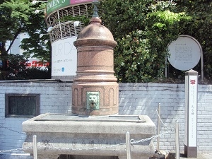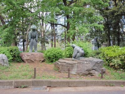 淀橋浄水場だった場所に昭和43年、都立公園(その後新宿区に移管)として開園された新宿中央公園内にあります。この像は太田道灌と紅皿の逸話で、狩りに出かけた道灌は途中大雨に合い、蓑を貸してほしいと農家を訪ねたところ、農家の若い娘紅皿は一輪のヤマブキの花を差し出します(七重八重花は咲けども山吹の 蓑(実の)ひとつだに亡きぞ悲しき)。娘の行動に怒った道灌はその場を立ち去ります。後に道灌の部下から説明を受け、自分の和歌の知識不足を恥、精進し、文武両道の侍になったというエピソードです。