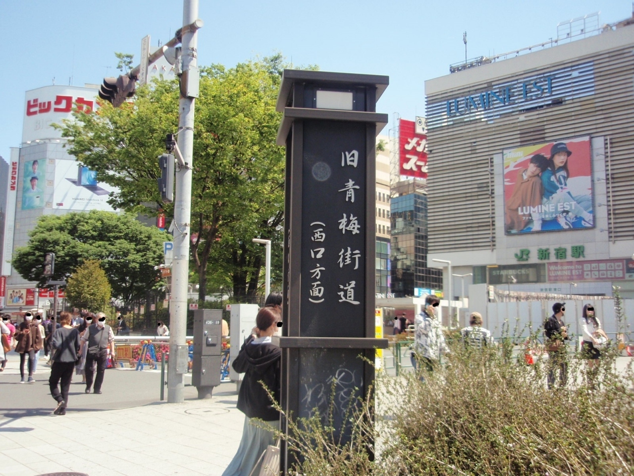 新宿駅東口(西口方面と表示)に建っています。現青梅街道は靖国通りから新宿大ガード下を通って青梅に抜けるようになっています。旧青梅街道は江戸時代、江戸と甲府を結ぶ街道で甲州裏街道とも呼ばれました。甲州街道とは現在の新宿三丁目で分かれ、角筈ガード下を通って青梅・大菩薩峠を経由して甲府に入ります。起点は新宿三丁目辺りだと思われますが、角筈ガードは東口に近い所から、ここ東口に建てられていても良いのかと思われます。なお同じような標識が線路を挟んで西口にも建てられているそうです