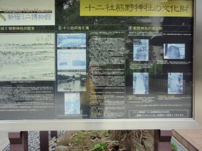 創建は1394~1428年、鈴木九郎が故郷の紀州熊野三山より十二所権現をうつし祀ったのが始まりとされる熊野神社には、神輿殿、神楽殿、手水舎、右手に十二社の碑、拝殿、本殿、太田南畝の水鉢、境内社大鳥神社、狛犬像、胡桃下稲荷神社、弁天社等多くの文化財があります。その中の一つに十二社の碑があります。ここ十二社の地が池や滝を擁した江戸西郊の景勝地であることを記した記念碑で1851年3月に建てられました。江戸時代末「江戸繁盛記」の著者寺門静軒と中野宝仙寺の僧負笈道人によって十二社の様子を紹介したもので、表は僧負笈道人の撰になる碑文と寺門静軒の漢詩が刻まれている。残念ながらマンション建設で無くなり、境内にあるパネルに紹介されている写真でしか見ることはできません。大都会にある文化財の運命かもしれません