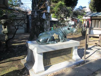 創建は不詳、1573~1592年ごろ新井薬師開基の沙門行春が建立したともいわれる。主祭神は菅原道真です。別名新井天神という。鳥居を潜ると、手水舎、撫で牛、石造五重塔、境内社津島神社・宝樹稲荷社・大鳥神社、正面に建て替えられた拝殿、その他、神楽殿、枝垂桜、保存樹木ケヤキ等があります。手水舎の屋根として見かけない珍しい形をしているので目を惹きました。天満宮というと必ず撫で牛があります。お稲荷さんには狐、八幡宮には鳩とという聖なる鳥獣です。最近目が悪くなってきたので、目を撫で病気が進まないようお祈りしました。
