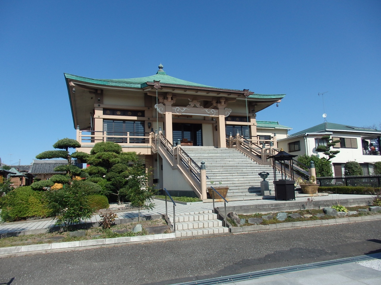 浄土宗の一寺、開山は岌善和尚です。山門、本堂、樹木と石で作られた整備された小さな庭園、塩地蔵尊、閻魔大王、大長大仏、芭蕉句碑等が配されています。芭蕉句碑の碑裏には行田で活躍した江戸時代の俳人「多少庵秋瓜謹書」とありますので、秋瓜が建てた碑なのでしょうか。小石、石、樹木を配した小さな整備された庭園が綺麗です。山門や本堂は鉄筋コンクリート製ですが、最近各所で鉄筋コンクリート製の社殿を見ることが多くなりました。耐久性の観点からでしょうが、私には何か違和感があります