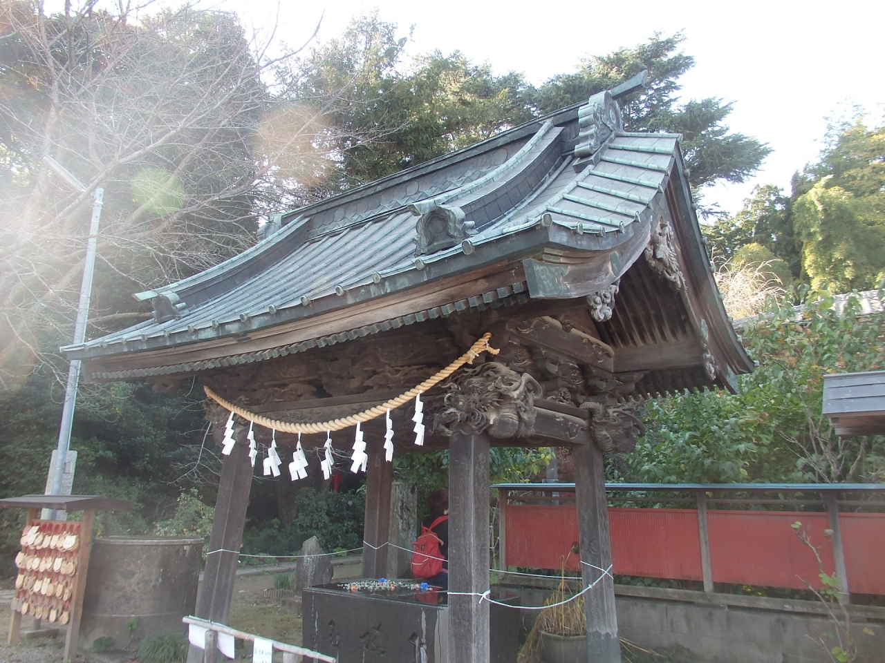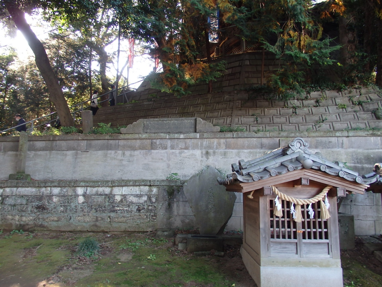 大鳥居の左手に市天然記念物の大槙の木、市有形文化財の大鳥居を潜り進むと手水舎と神楽殿がある。石段を登る途中に境内社浅間神社と石灯籠がある。石灯籠には万葉和歌が記載されているようですが私には読めません。浅間塚古墳の頂上に本殿と拝殿が建っています。手水舎と拝殿軒下の彫刻は見事です。1000年以上前から神社はあったとされるのですが、石垣で補強されているとはいえ(?)、古墳の上に建つ社殿は崩れ落ちないのかと心配になります