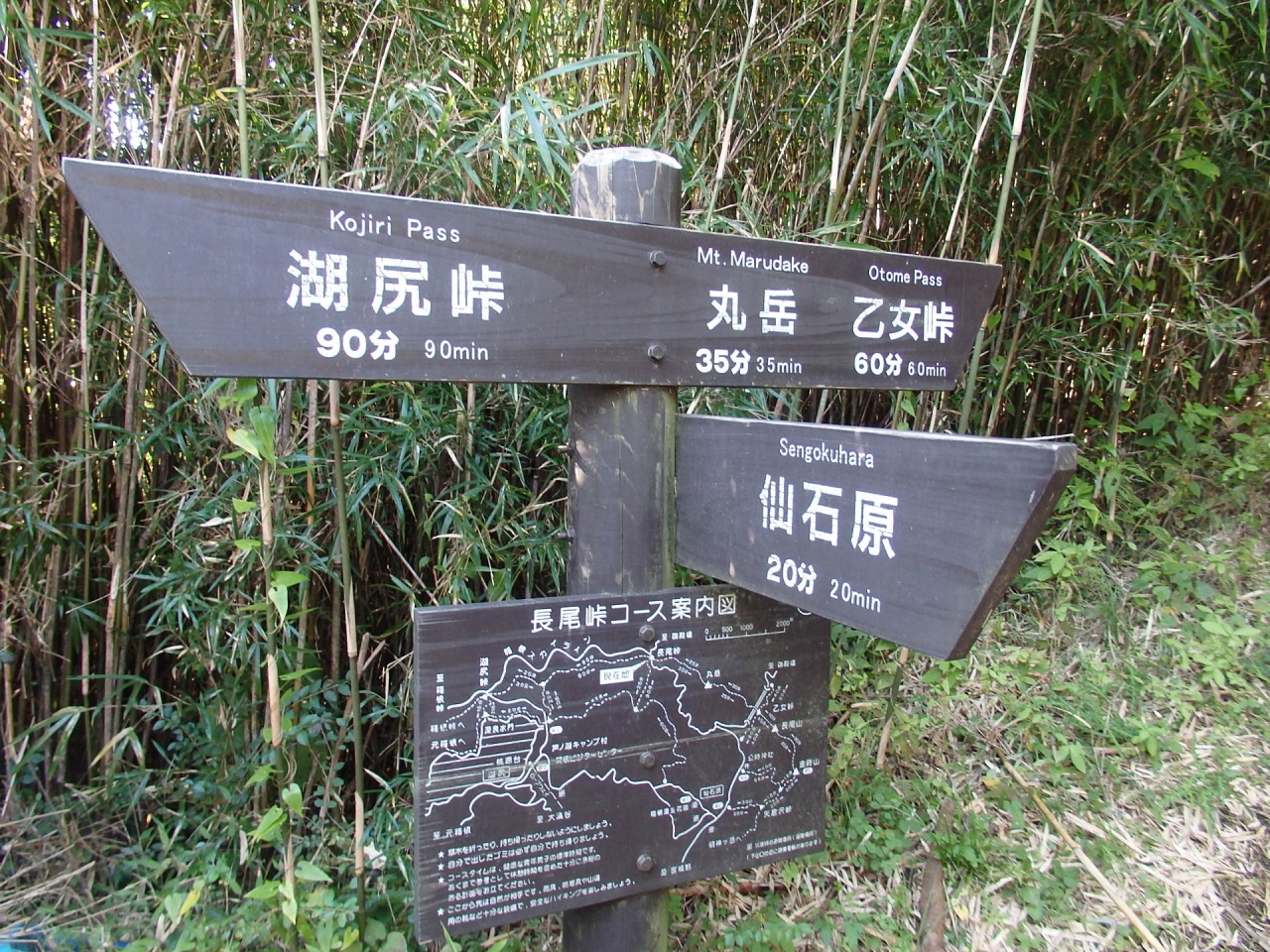 乙女登山口から割と急登りの登山道を経て、2時間強長尾峠(山道)に到着しました。分岐になっており、左に下れば耕牧舎、直進すれば湖尻峠です。まわりは人間の背よりかなり高い笹で覆われ、全く展望はありません。10分程耕牧舎側に下ると自動車道(国道138号線と箱根スカイラインを繋ぐ舗装道)の長尾峠に着きます。長尾峠の石碑と舗装道先に長尾隧道があるのみです。峠と聞き何かビューポイントがあるのかと期待しましたが、見るべきものは何もありませんでした