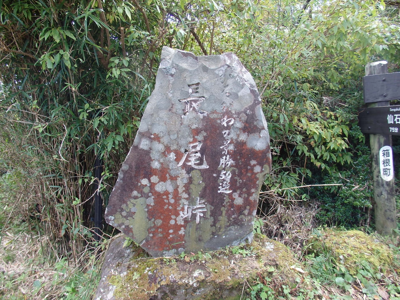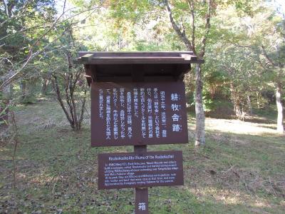 乙女登山口から割と急登りの登山道、乙女峠、丸岳、長尾峠を経て2時間半長尾峠分岐耕牧舎跡に到着しました。分岐になっており、左に行けば仙石原、右行けば桃源台です。明治の初め、渋沢栄一らが耕牧舎という会社を設立し、この辺りを牧場にして牛馬を放牧、乳製品や牛肉を販売していました。碑と説明版が立っているのみで、牧場があったとは想像できません。跡地にはベンチもあり、山から下りてきた場合または仙石原散策途中の休憩場所として最適かもしれません
