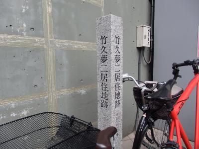 多くの美人画を残した明治・大正・昭和時代の画家・詩人(宵待草の作詞)です。大正時代末にここで住んでいたそうです。現在はホールの駐車場になっており、碑が建つのみで住居跡の形跡は何も見当たりません。当時の風景写真、説明版等が掲示されていればよいのですが、自転車置き場の一角にただ石柱のみとは、来た甲斐はありませんでした