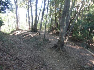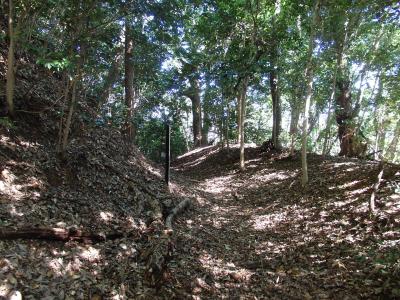 腰越城の築城主は伝山田直定、築城年十六世紀中ごろ、1590年落城します。腰越城木戸門通過し山道に入り、急登りの木段を15分ほど登ると 堀切に到着します。すぐに並行してもう一つ堀切があり、二重堀切になっています。二の郭、次に本郭に到着、本郭城址碑、本末跡碑、腰越城説明版が建っています。本郭を出て虎口、竪堀・堀切、西の郭、囮虎口、土塁を見ます。囮虎口というのを初めて知りました。本郭は大きな郭ではありませんが、多くの山城遺構が残っており見られます。続日本100名城に相当する城址です。お城ファンには見逃せないお城です