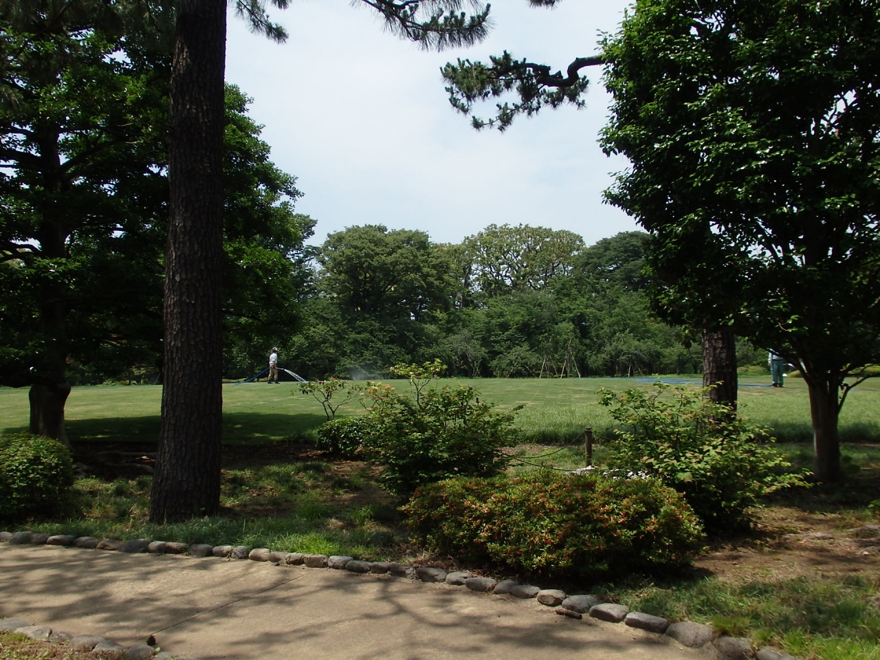 大手三の門を過ぎ、北に向かうとある池泉回遊式庭園、滝、菖蒲園、都道府県の木、茶屋、