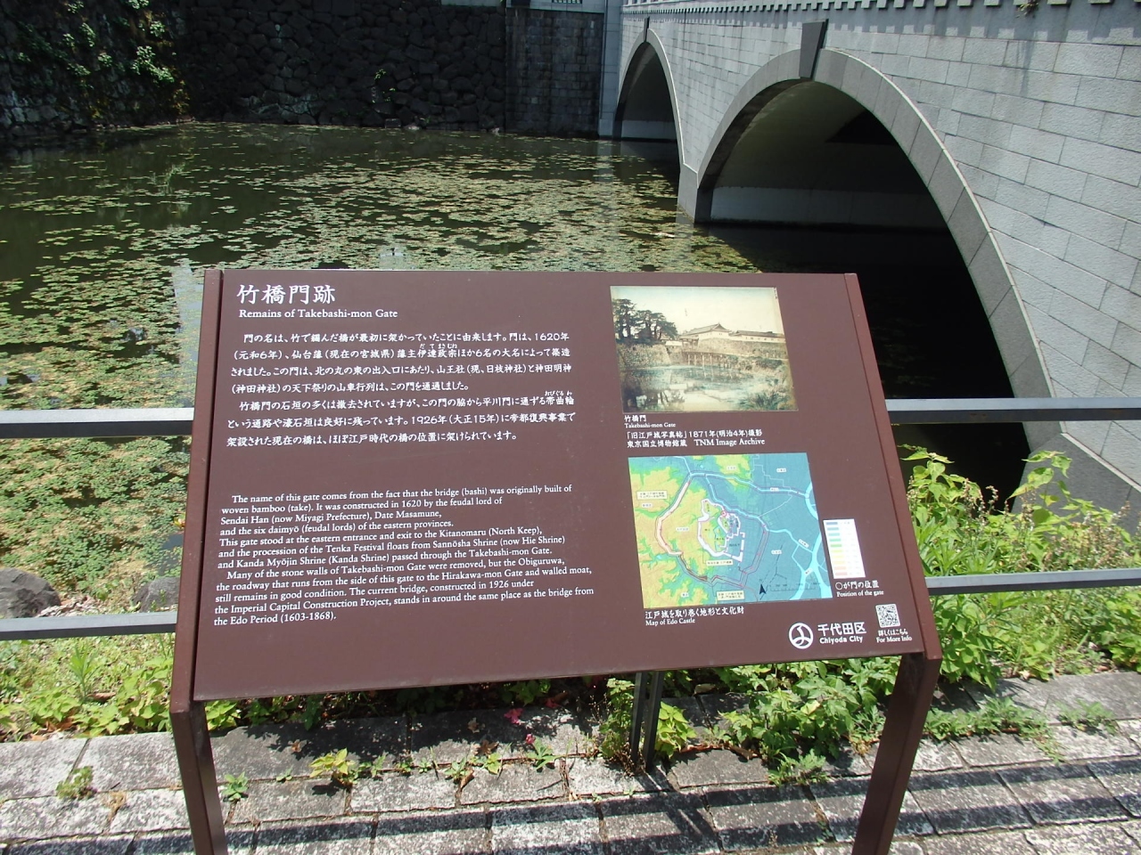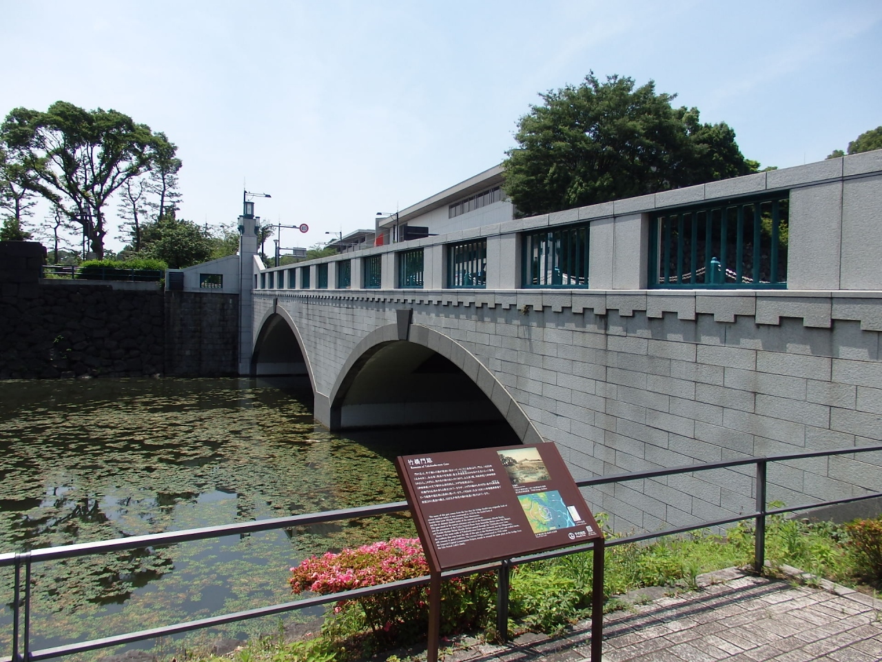 平川堀を帯曲輪で分断した内側の堀を渡る橋で(旧江戸城内曲輪15門の一つ)、北の丸の東の門になります。竹で編んだ橋が架かっていたところからその名が付きました。大正15年コンクリート製アーチ形橋に建て替えられました。都市発展にはやむをえないことかもしれませんが、残念ですね。竹橋門の石垣が橋付近に残っています。今のコンクリート製アーチ形橋姿からは想像できませんが、橋の傍の説明版の中に、建て替える前の橋の写真(竹ではなく、木橋のようです)が載っています。現在は車や人の往来が激しく、当時の面影は全くありません