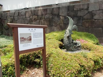渡櫓門のシャチは大手門渡櫓の傍に置かれています。大手門は江戸城の正門で、諸大名はここから登城しました。渡櫓門は枡形門を形成する2つの門(渡櫓門と高麗門)の内側の大きい門です。大手門は昭和20年の空襲で焼失し、現在の大手門は昭和42年に復元されたものです。展示されているシャチは焼失した渡櫓門上に飾られていたものです。シャチの頭部には1657年と刻まれているので、明暦の大火後この門は再建されたものでしょうか。シャチは大きな渡櫓門上だと目立ちませんが、地上目の前で見ると意外と大きいものだとびっくりしました