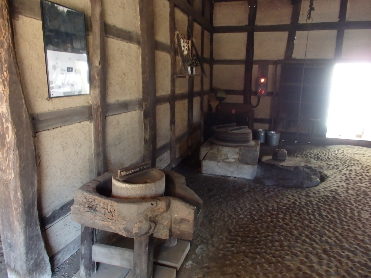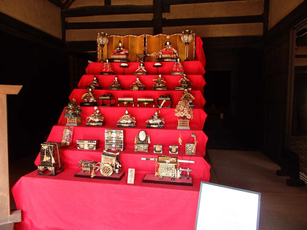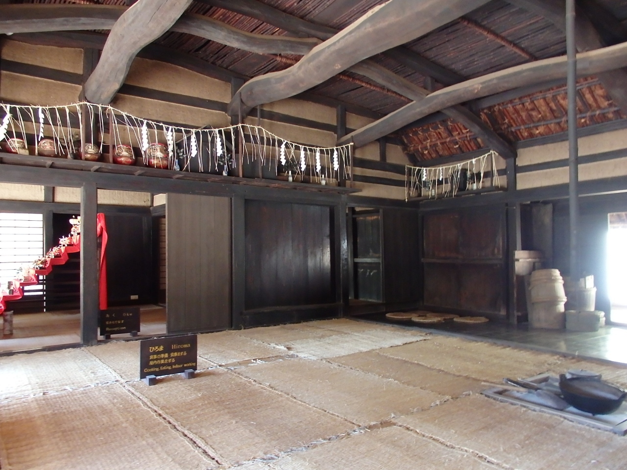 旧北村家住宅は国指定重要文化財で名主の家です。移築解体の際、建築年(1687年)を示す墨書が発見された貴重な民家です。正面の格子窓、居間部分の押し板や竹すのこ床など古い特色を持つ割には開放的な民家です。同じ神奈川県の民家旧伊藤家住宅と違うのは濡れ縁が付いています。居間の神棚の上に達磨さんが並べてあります。これは毎年暮れに前年に購入したものより大きな達磨を買い求める習わしがありました。どこまで大きな達磨があるのでしょうか。時節柄ひな壇が飾られていました。他の古民家に比べ室内が大変明るく感じられました