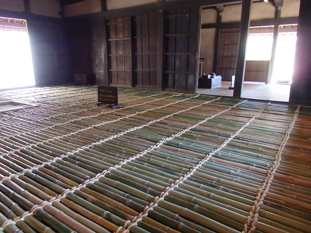 旧伊藤家住宅は国指定重要文化財で、入母屋造りの農家で名主を務められていた方の住まいです。日本民家園誕生のきっかけとなった古民家です。正面の格子窓をシシマドと呼び、獣の侵入を防ぐためのものだといわれています。広い土間にはみそぐら、竈等があります。居間の竹すのこ床、1間ごとに立つ柱等古い形式を持つ古民家です。竹すのこ床は板敷に比べ安価だろうと思いますが、夏は涼しいかもしれませんが、筵がこの上に被せられるにしても、冬は寒いでしょうと心配します