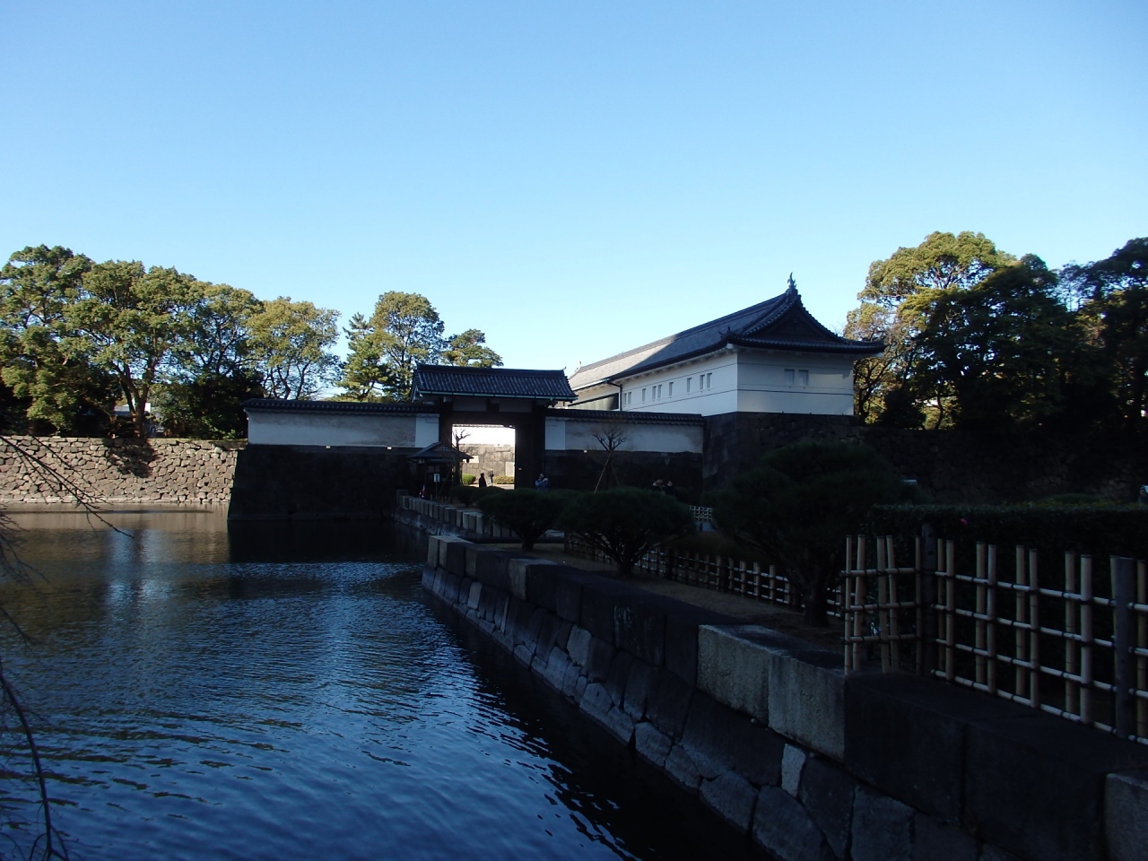 江戸時代は本丸のすぐ北にある門で、現在は皇居東御苑に入る入口の一つです。本丸に近いこともあって防御上、石垣の高さは一番高いそうです。江戸城の他の石垣に比べ圧倒的高いのに驚かされます。迫力があります。また橋は跳ね橋になっており、江戸時代は常時跳ね上げられた状態だったようです。ここも枡形門を形成していたようですが、現在、内の門は無く、外の門の高麗門があるのみです。大手門に比べ圧倒的に観光客は少なく、人出が多い場合は北桔橋門を利用した方がベターです。高麗門というのは門の構造の種類の一つで、屋根が3つあるのが特徴で、写真はそれをよく表わしています