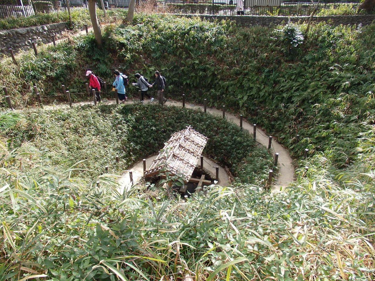 羽村駅東口から歩いて3分ほどの所にあるまいまいず井戸です。五の神社と一緒に並んであります。井戸に向かって降りる通路の形がカタツムリに似ているところからこの名が付きました。井戸を掘るのに砂礫層地帯の関係からこのような形態がとられたとのことです。井戸の穴の周りは赤子の頭ぐらいの大きさの石を積み重ねています。砂礫層ですので、深く掘らないと水が出てこない分、深さをかせぐための手段であると想像できます。昔の人の知恵は素晴らしいと感心させられます。府中郷土の森博物館でも見ることができます