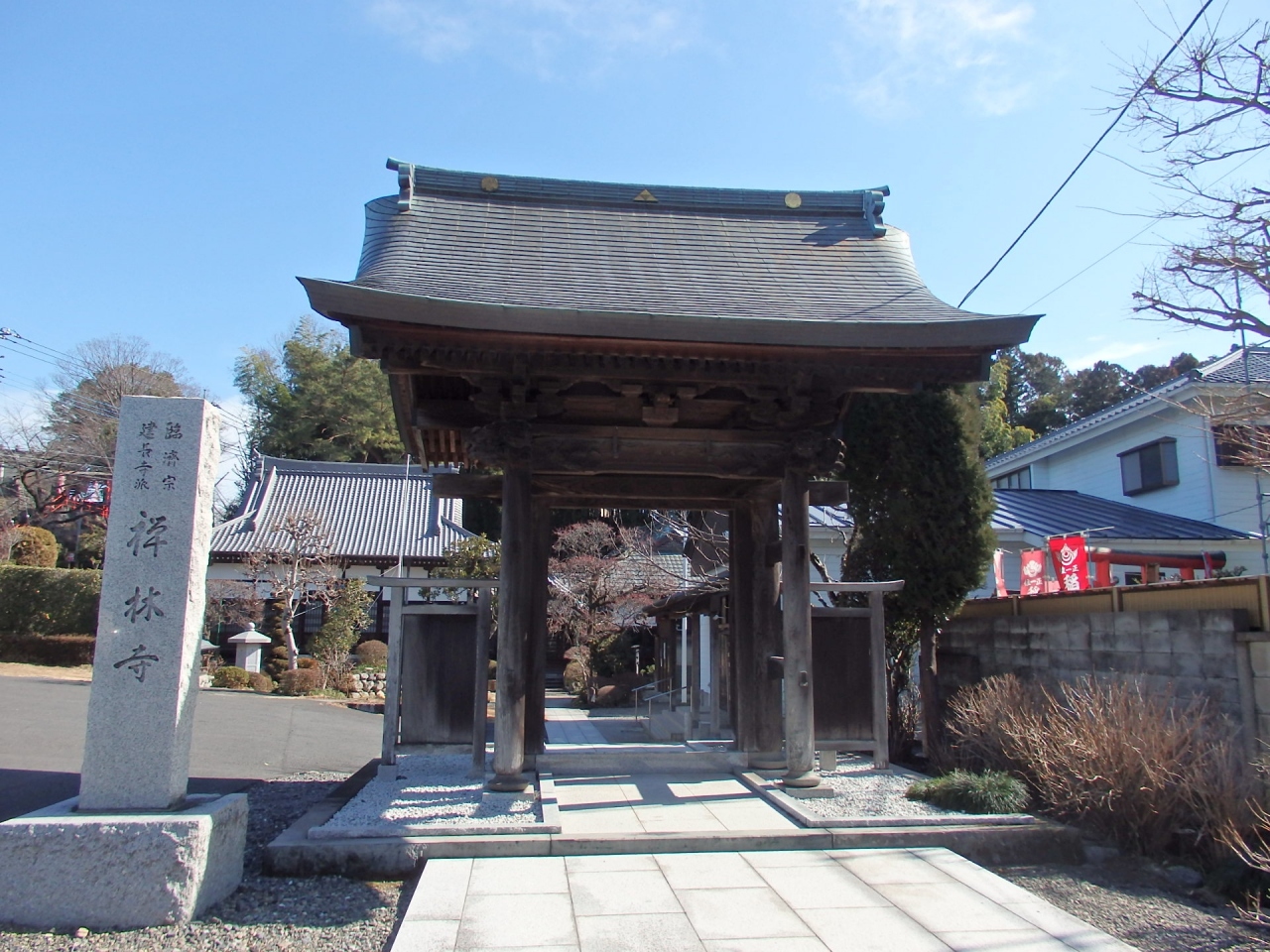 羽村駅西口から歩いて5~6分ほどの所に禅林寺はあります。臨済宗建長寺派の一寺で、開基は島田九朗右衛門、開山は春学禅師です。注目すべきは文筆家中里介山のお墓があります。本堂に左側に回り込んで小高いところの墓地にあります。彼が書いた長編小説大菩薩峠が映画化され、主人公机龍之介を演じた片岡千恵蔵の映画を思い出します。五輪塔の立派なお墓で感心しました。大きくはありませんが山門の彫刻がちょっと目を引きます