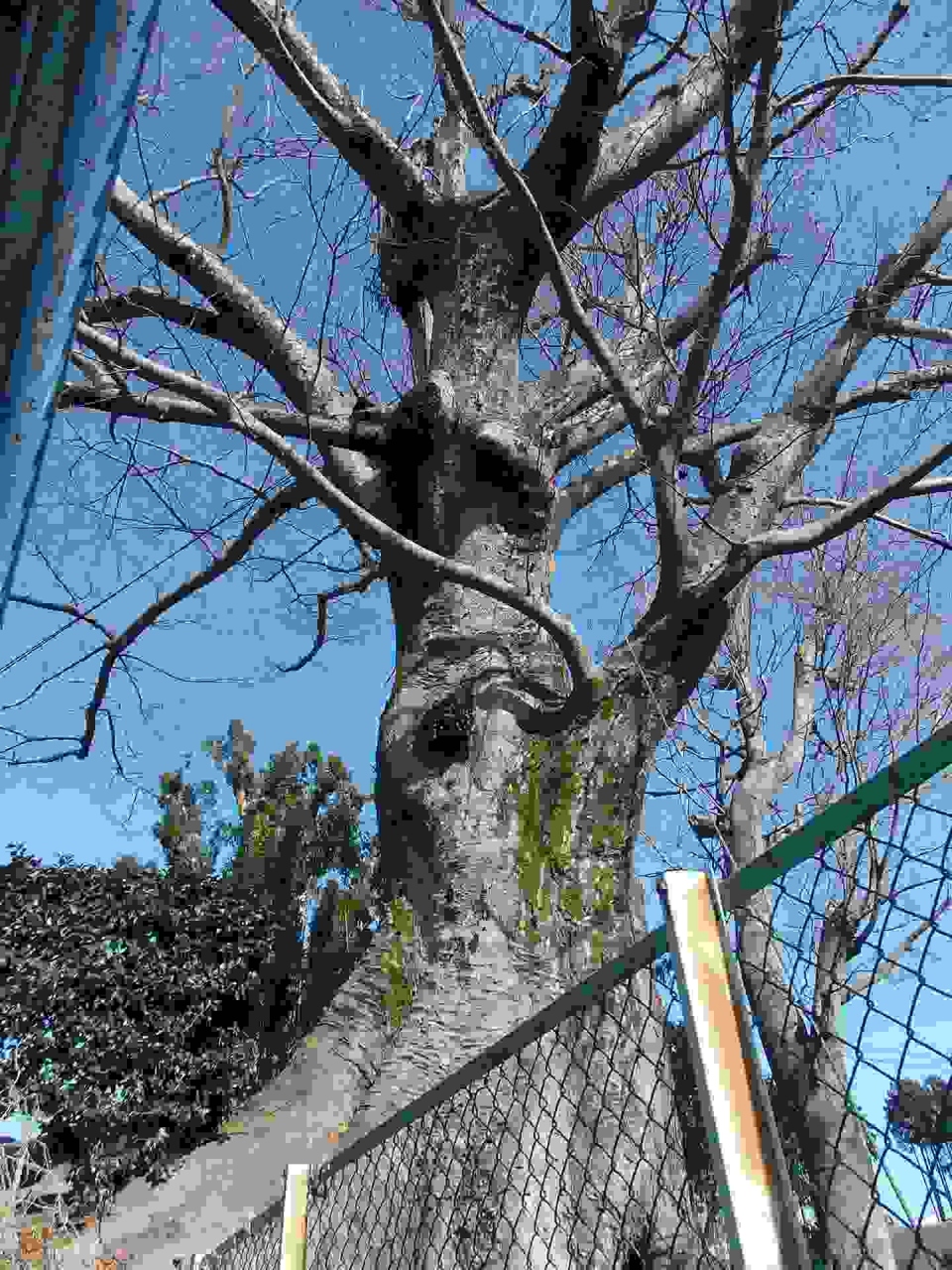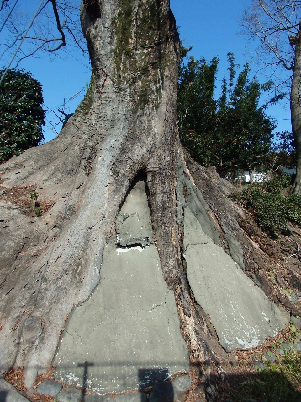 羽村駅西口から歩いて10分ほどの所の羽村橋手前の所にあります。周回り7.2M、木の高さ25M、樹齢400~600年ともいわれています。根は南側崖下にむき出しに伸びていて、よく生命が保たれているなと感心します。駅から羽村堰に行くときは、ケヤキの木を見落としてしまっていたのですが、帰りには羽村橋から見上げる位置にあるので、見つけることが出来ました。駅からくる場合は羽村橋手前の左に注目して歩いていると見落としませんよ