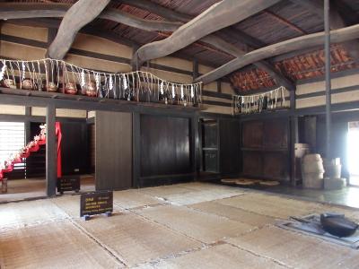 旧作田家住宅は国指定重要文化財で九十九里浜地引網漁の網元の民家です。建築年代は十七世紀末です。棟を別にする広い分棟型民家で、棟と棟の間には大きな雨樋が設けられています。海岸に漁具小屋を持っていたので、居住屋に漁具庫は必要なかったようです。注目すべきは、居間の梁は松の曲材を巧みに組み合わせている芸術的形状の梁です。上手く組み合わされたものだと感心します