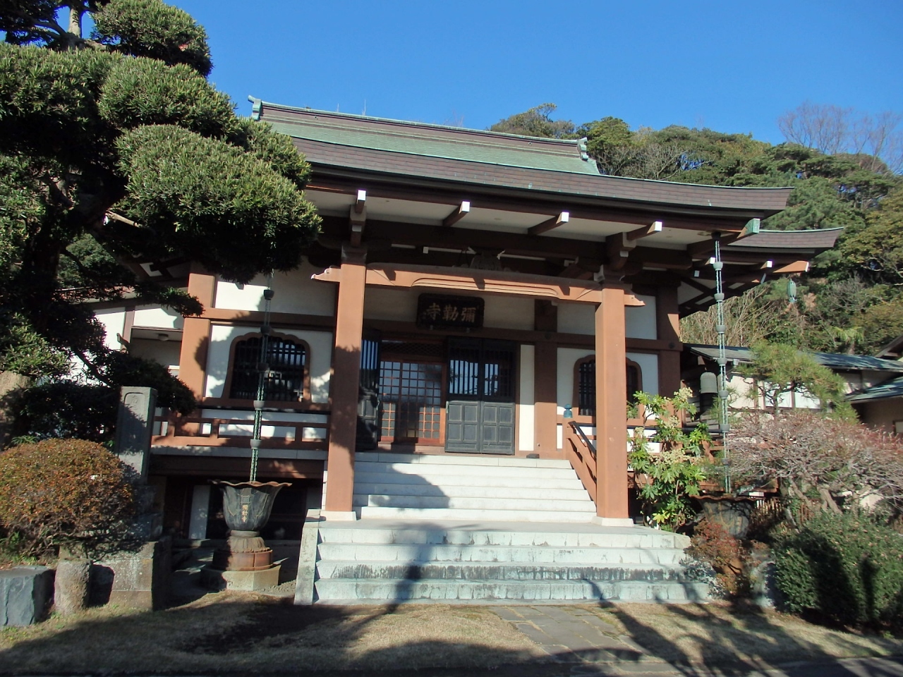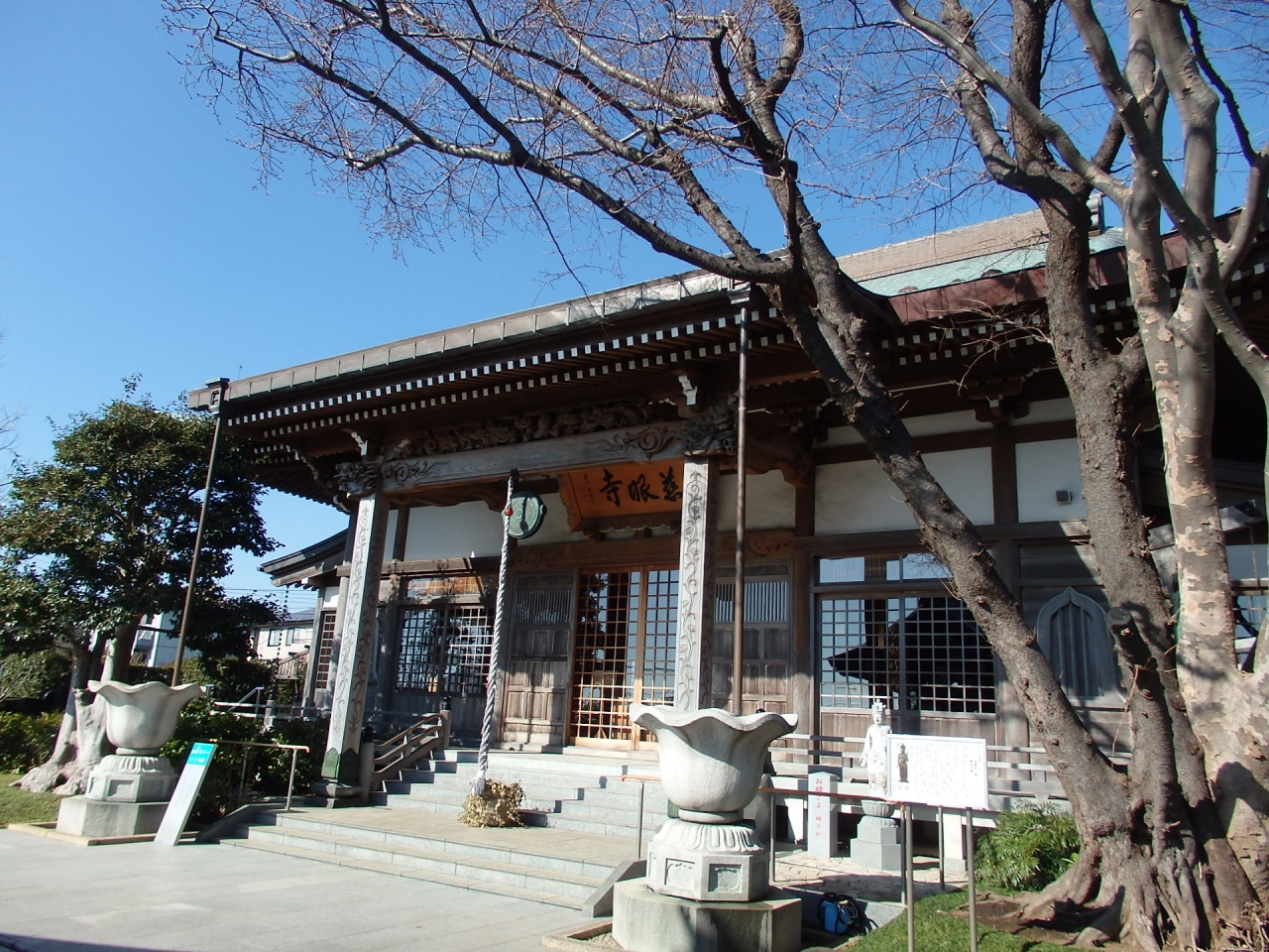日蓮宗の一寺、1226年創建、開基は北条泰時(鎌倉幕府第三代執権)、本尊は日蓮上人です。このあたりの地名の由来となった古い寺です。境内には山門、本堂の小さな寺院です。樹木はきれいに刈り込まれ整備されているなと感じました。山門はお寺らしく風情がありますが、本堂はコンクリート製で少し風情に欠けます