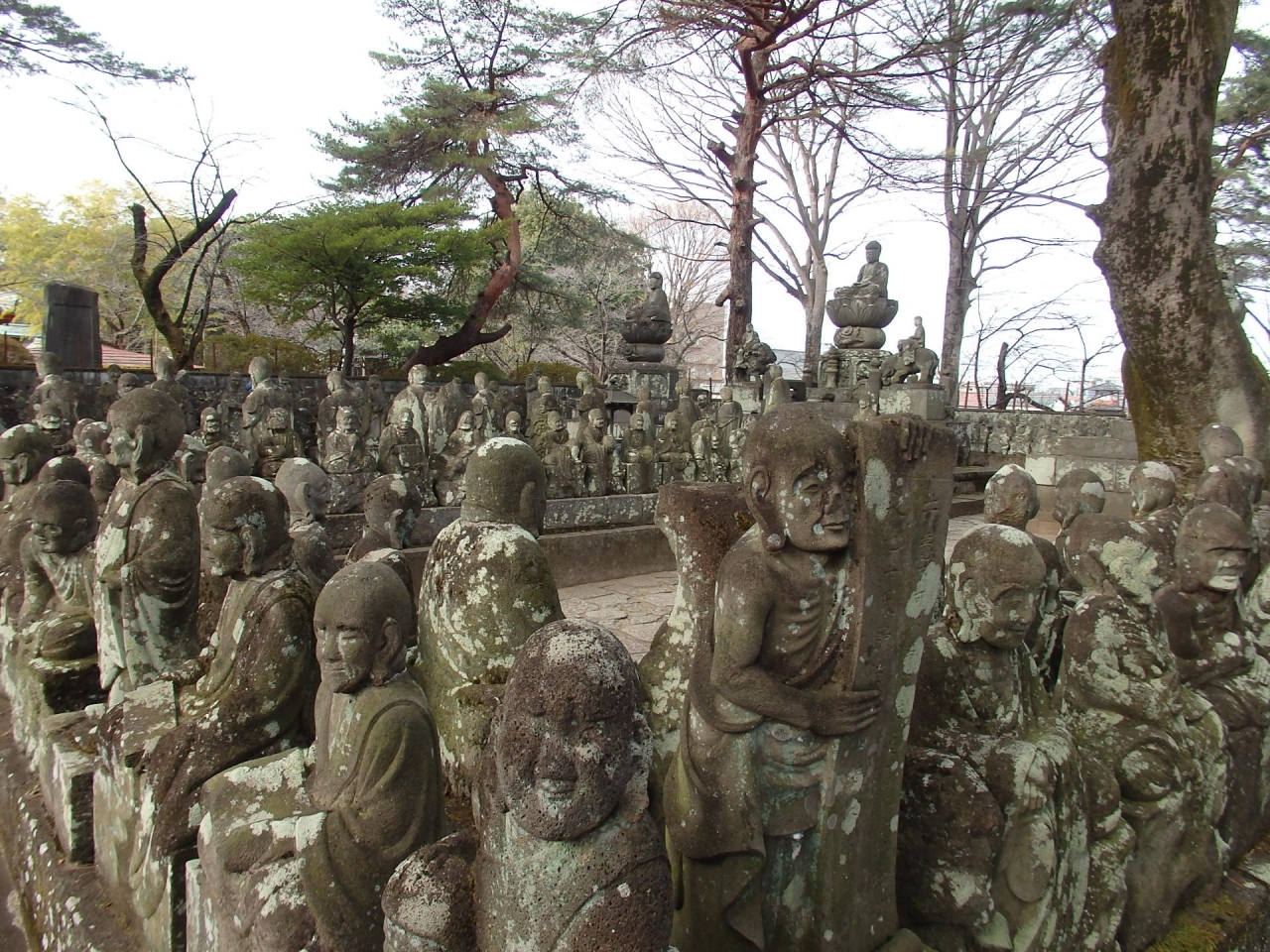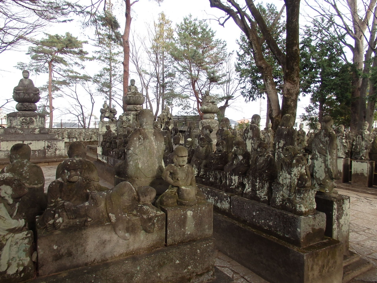 日本三大五百羅漢の一つで50年間にわたって建立されたものです。十大弟子、十六羅漢等
