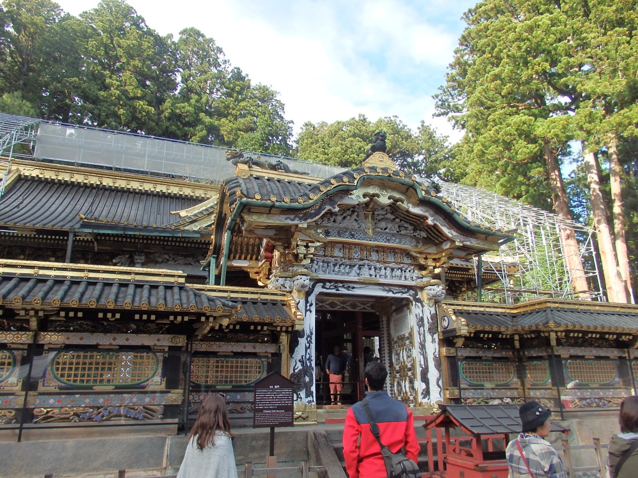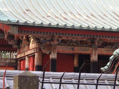唐門の奥に見えるのが拝殿で御本社の一つをなす建物で国宝です。拝殿の天井には狩野探幽等による100種の龍の絵が描かれ、長押には伝土佐光紀による三十六歌仙の額がかか り、襖には狩野探幽の絵、その他獅子の彫刻が施され、絢爛豪華という表現しか見つけられません
