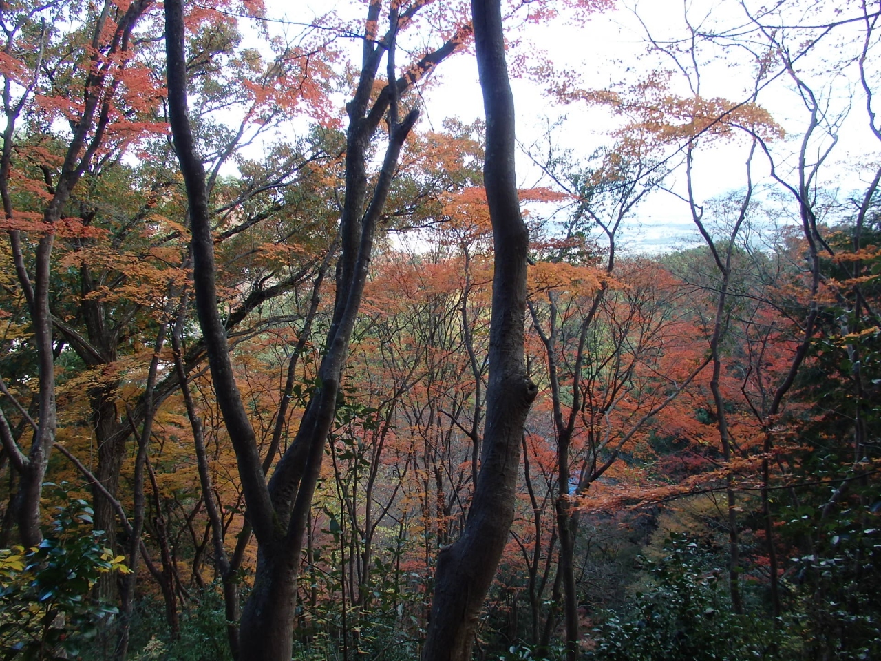 ンを凌いで1時間47分、富士見台(548M)に到着しました。小さな広場になっています。西南西が開け、雪をかぶった富士山がくっきりと見えます。山頂から富士山をみるのは登山の醍醐味の一つです。下りは八王子城址に下りました。城址にある八王子神社の紅葉は真っ盛できれいでした。本日のコース、標高差340Mは少なったのですが、急なアップダウンが多く