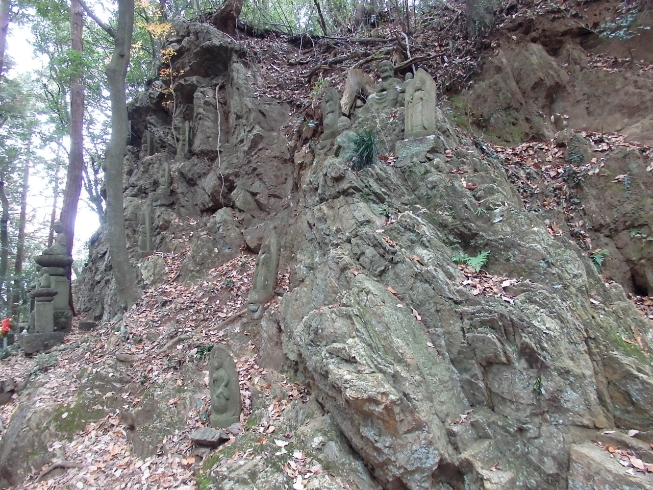 能仁寺から歩き始めて17分十六羅漢仏があるところに着きました。羅漢仏だけではなく、釈迦如来、地蔵菩薩、弥勒菩薩等も見られます。十六羅漢仏は釈迦の命により、世に長く留まり仏法を護持する弟子十六人の阿羅漢を指します。徳川綱吉の病気平癒の折、生母桂昌院が報恩感謝の印にこの十六羅漢仏を寄進されたと伝えられています。色々なポーズや表情をされています。笑っています、怒っています、難しい顔をしています、何をしているか分からない顔もあります。見ていて飽きませんでした