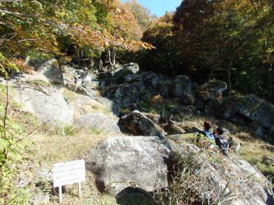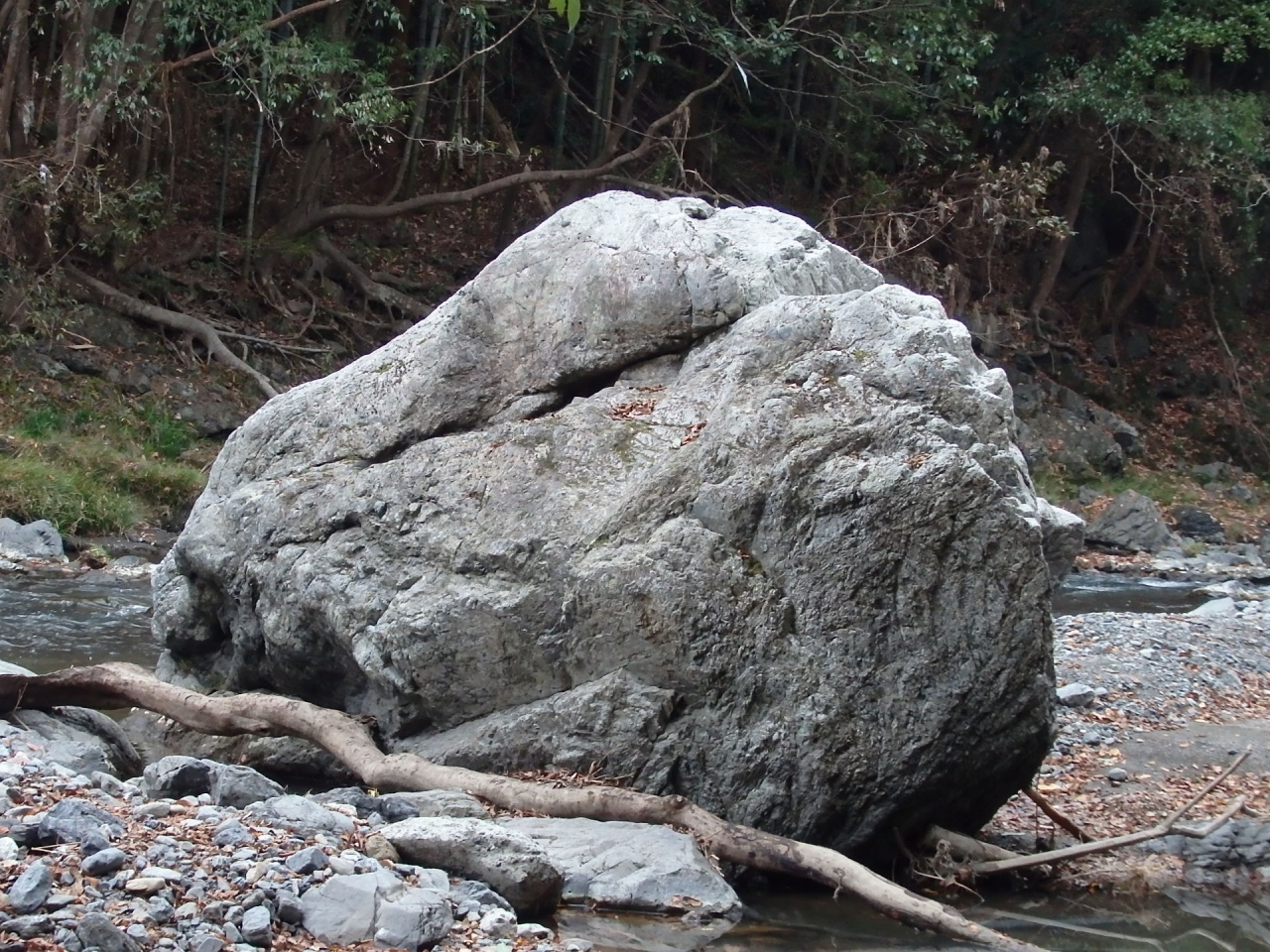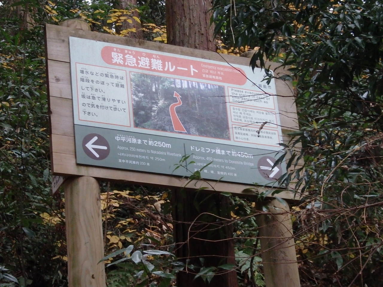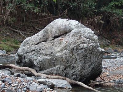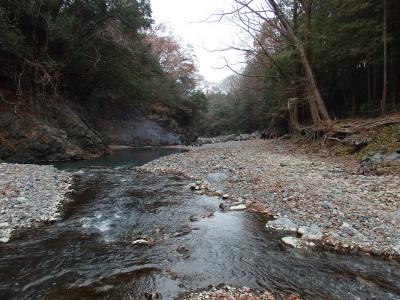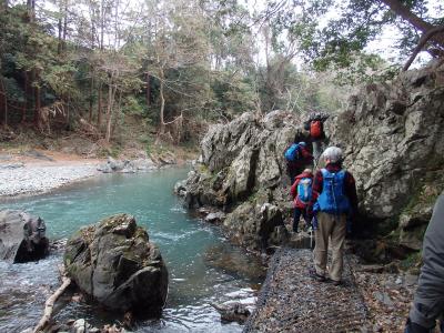 天覧山・多峯主山に登った後、吾妻狭に寄りました。多峯主山山頂から下って約1時間弱で吾妻狭に到着しました。吾妻狭は入間川の上流にある渓谷です。川にはドレミファ橋という名のついた飛び石の橋があり、これを右岸に渡り、河原を下流に向かって下りました。川石の上を歩くので歩きにくいですが、途中、汽車淵、兎岩、赤岩があり目を楽しませてくれます。増水時の緊急避難ルートも設置されていました。小さな子供連れで川遊び、バーベキューをするのに適しています。樹木に覆われているので夏でも涼しそうです