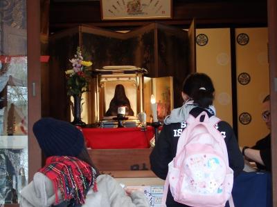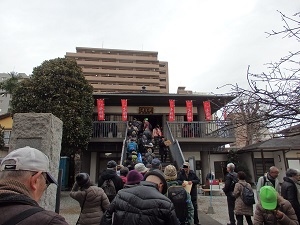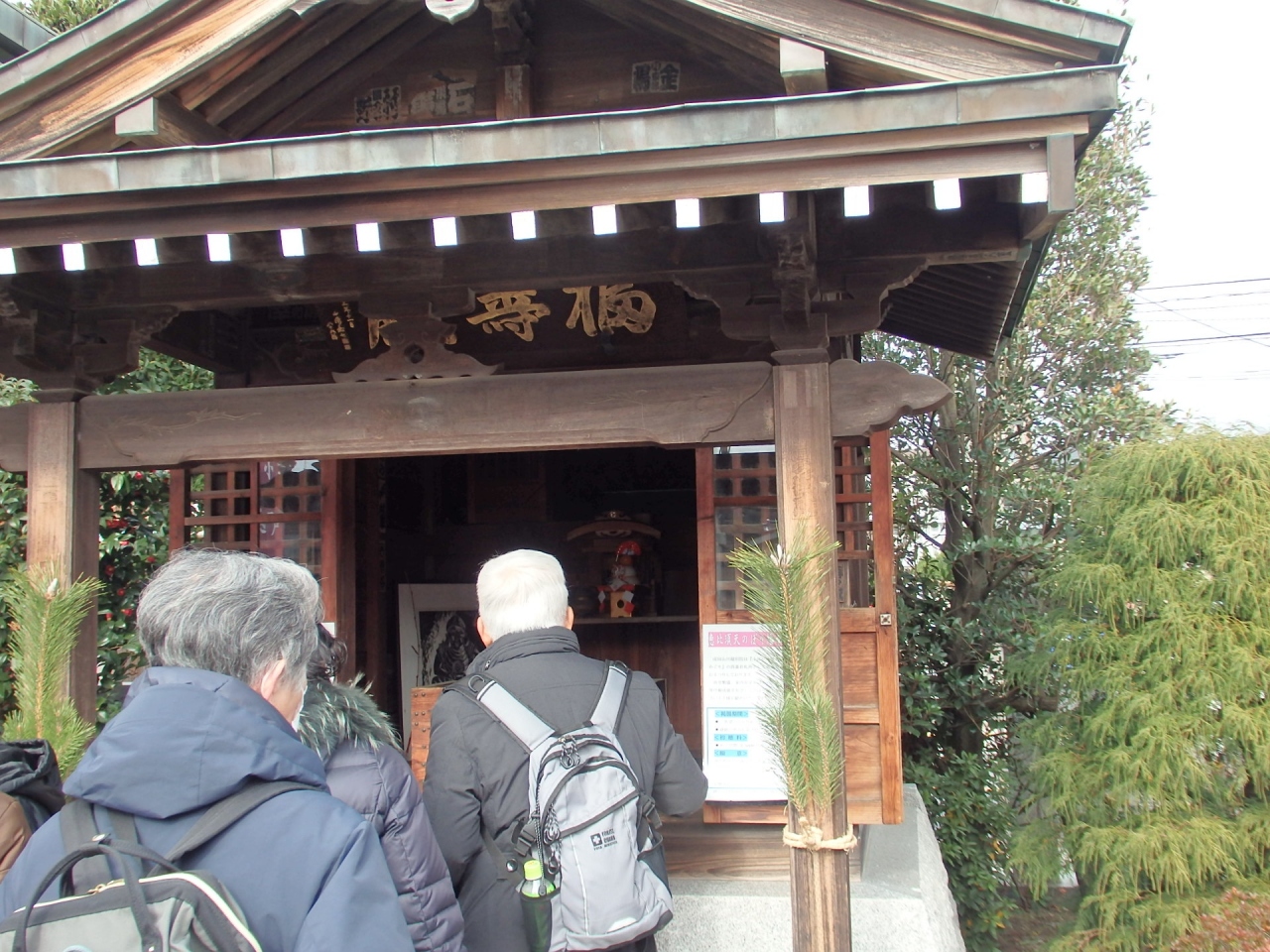 妙善寺は天台宗の一寺、創建は1624年。開山は尊能法印、本尊は不動明王です。川越七福神の第一番毘沙門天がおられる寺院です。門を入ると、正面に昭和53年に再建された本堂があります。本堂内陣手前に毘沙門天は安置されています。境内にはさつまいもを抱えたさつまいも地蔵尊、水琴窟がありました。毘沙門天はインド出身の軍神で、開運勝利の神様です。葉を付けた蝋梅の木が1本あり、芳香を放っていました。こじんまりしたお寺の上に、七福神第一番目であるために、大勢の参拝客(団体の七福神巡り客)がおり、混雑していました。時間を遅くするか、七番目から逆回りした方が良いかもしれません