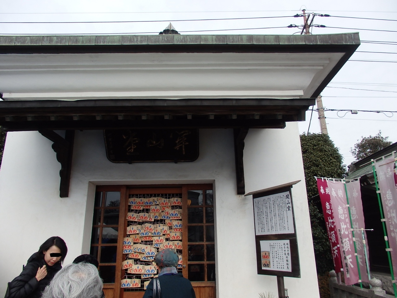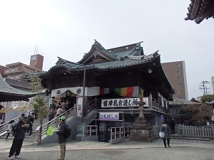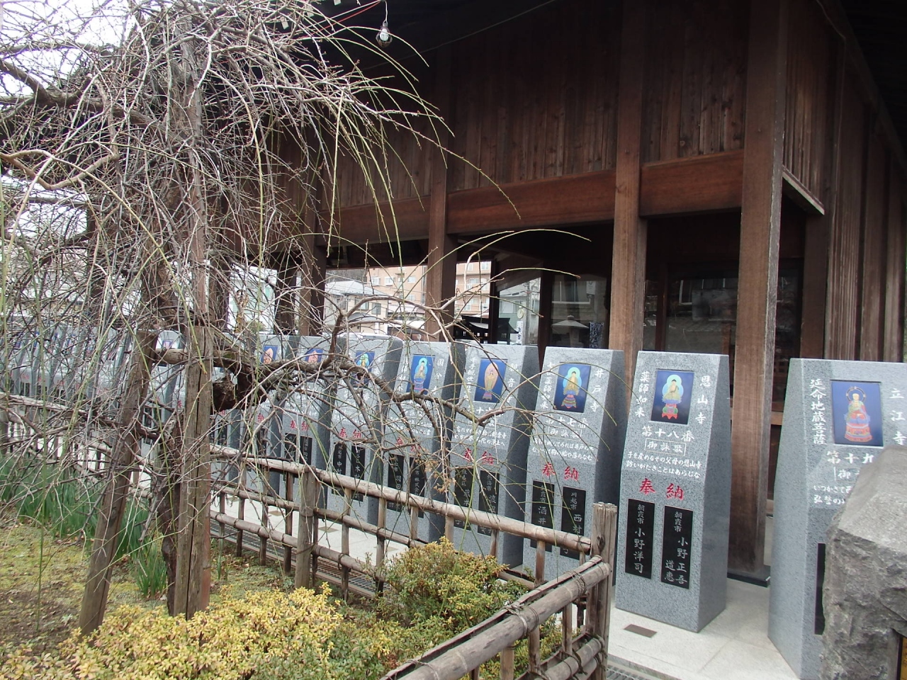 成田山川越別院本堂 真言宗智山派の一寺で、創建は伝1853年、開山は石川照温上人、本尊は不動明王です。通称成田山または川越不動は大本山成田山新勝寺の別院で正式名は成田山川越別院本行院と言います。山門をくぐると、右手に大師堂がありその中に弘法大師像が祀られており、大師堂の周りには四国霊場八十八ケ寺の御詠歌石碑が建てられています。その先には出世稲荷神社、恵比寿天が祀られている福寿殿、開山石川照温上人が祀られている開山堂、水琴窟、鐘楼、亀の池があり、正面には本堂があります。本堂の左手には祈祷殿があります。川越七福神の第四番恵比寿天がおられる寺院でもあります。恵比寿天は唯一日本出身の神で、商売繁盛、福の神の代表各です。大師堂の周りには四国霊場八十八ケ寺の御詠歌石碑が建てられています。ここを一周すれば四国霊場八十八ケ寺巡りをしたと同じご利益があります。私は四国四か所しか終了していないので、ここを一周しました。ここにも眼病平癒にご利益のある開山堂がありましたので家族のためにお参りしました