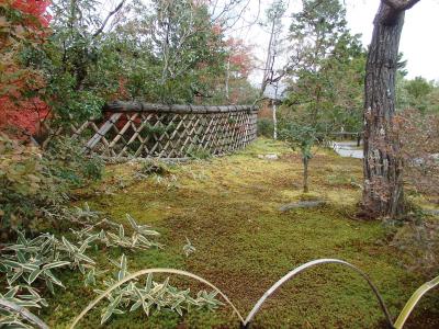 たずまいの中にある茶室(大虚亭)(寺内には7つの茶室が散在)を囲む光悦垣(竹を