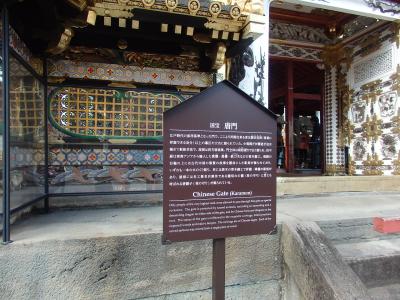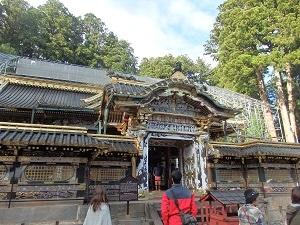 四方が唐破風(弓なりのアーチ型屋根の形状が特徴です)造りの屋根を持つ国宝建造物です。一般の人(神職も含む)通れず、現代では勅使が下向されたとき、江戸時代では将軍に拝謁できる身分の人に限られています。彫刻数は611体あり、山内一の多さを誇ります。金箔と胡粉(貝殻をすり潰した着色剤)が塗られた門は絢爛豪華です。その中で特徴的なものは門左右に張り付けてある寄木造の昇竜・降竜の彫刻と、屋根の上左右にある2匹の龍の彫刻、舜帝朝見の儀等の彫刻です。素晴らしい彫刻の数々で、彫刻ファンにはこの唐門の彫刻を見るだけでも一日が過ぎてしまうのではと思います
