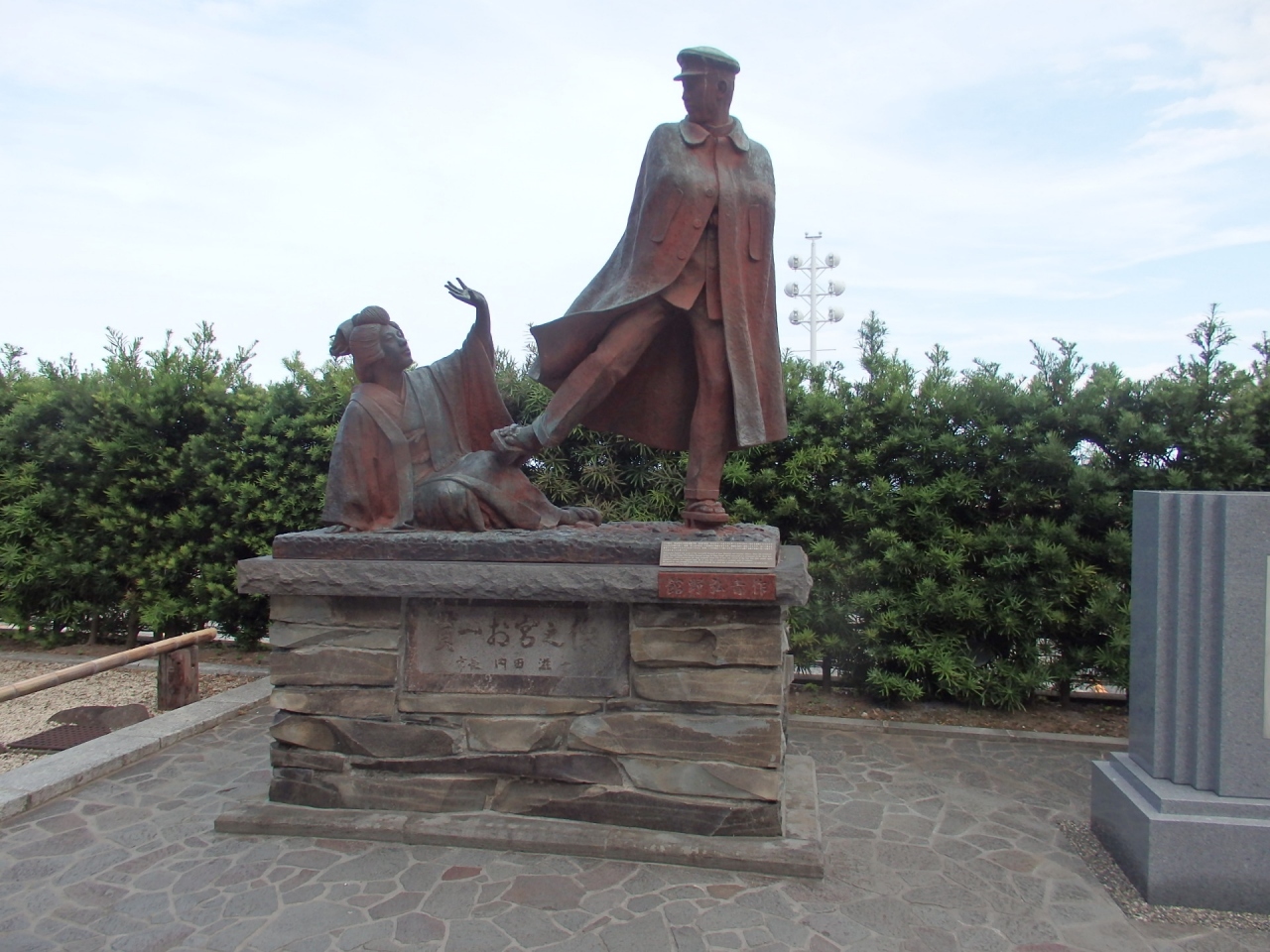 今までバスで通ったことしかありませんでしたが今日初めて歩いてここに来ました。熱海駅から歩いて15分弱の所にお宮緑地はあります。尾崎紅葉の代表作「金色夜叉」の中で寛一とお宮の別れの場所となった所です。これにより、熱海は有名になり観光名所となったようです。金色夜叉の碑、お宮の松、寛一とお宮の銅像の三点がここにあります。お宮の松は大昔、車で通ったときに見たときは枯れたような姿をしていたと記憶していますが、今は代替わりをしています。ここにはジャガランダの木が多く植えてあり、6月にはきれいな紫色の花が咲くので、これと合わせて訪れることをお勧めします