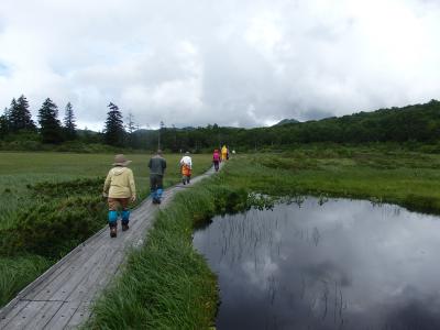 五色温泉お花畑駐車場からイワオヌプリ分岐、大沼湖岸、大谷地湿原を経由して4時間40分、神仙沼自然休養林休憩所(レストハウス)に到着しました。休憩を我慢して先に神仙沼に行きました。木道を進むと、ネバリノギラン、トキソウ、タチギボウシ、ミタケスゲ、ナガボノシロワレモコウ、ウメバチソウ、チングルマの果穂、等多くの花が見られます。歩き始めて15分神仙沼に到着しました。神秘的な雰囲気から神仙沼と名付けられました。神仙沼湿原の中で最大の沼です。穏やかな沼で、長く居座って見ていたい気分になります。ミツガシワの花は終了し実がなっていました。時間関係もあり6分ほどで引き返しました