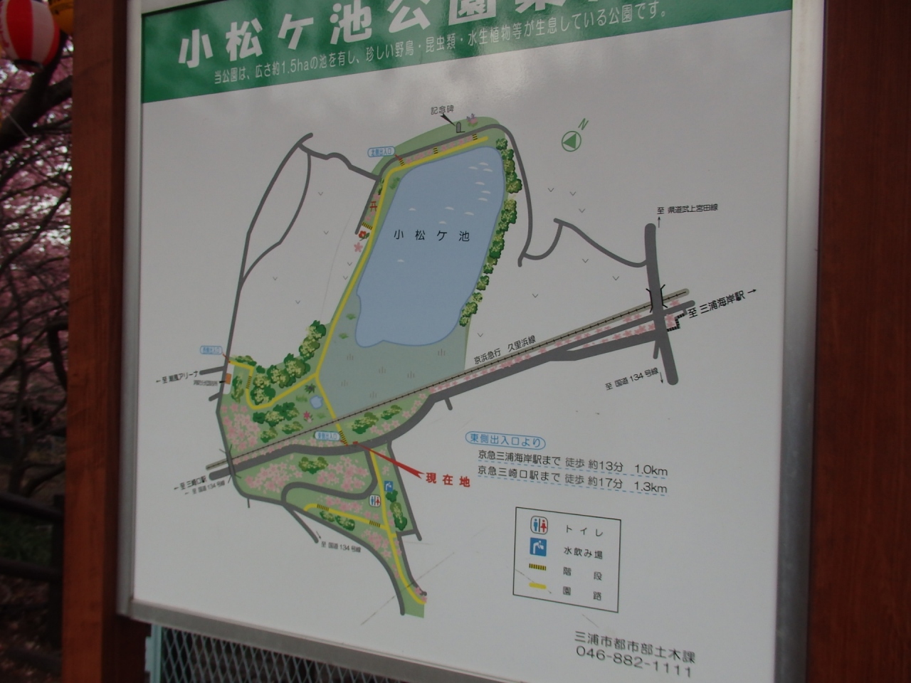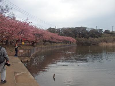 三浦海岸駅から河津桜が満開な道を20分ほど、三崎口駅に進むと右手に小松ケ池が見えてきます。鴨が池の上に浮かんでいます。1.5haの小松ケ池を中心に公園になっています。渡り鳥に飛来池になっており、鴨やサギが飛んでくるようです。桜まつりのメイン会場の一つにもなっており、今数十本の河津桜が満開を迎え、見事な姿を楽しませてくれています。立ち寄りすることをお勧めします