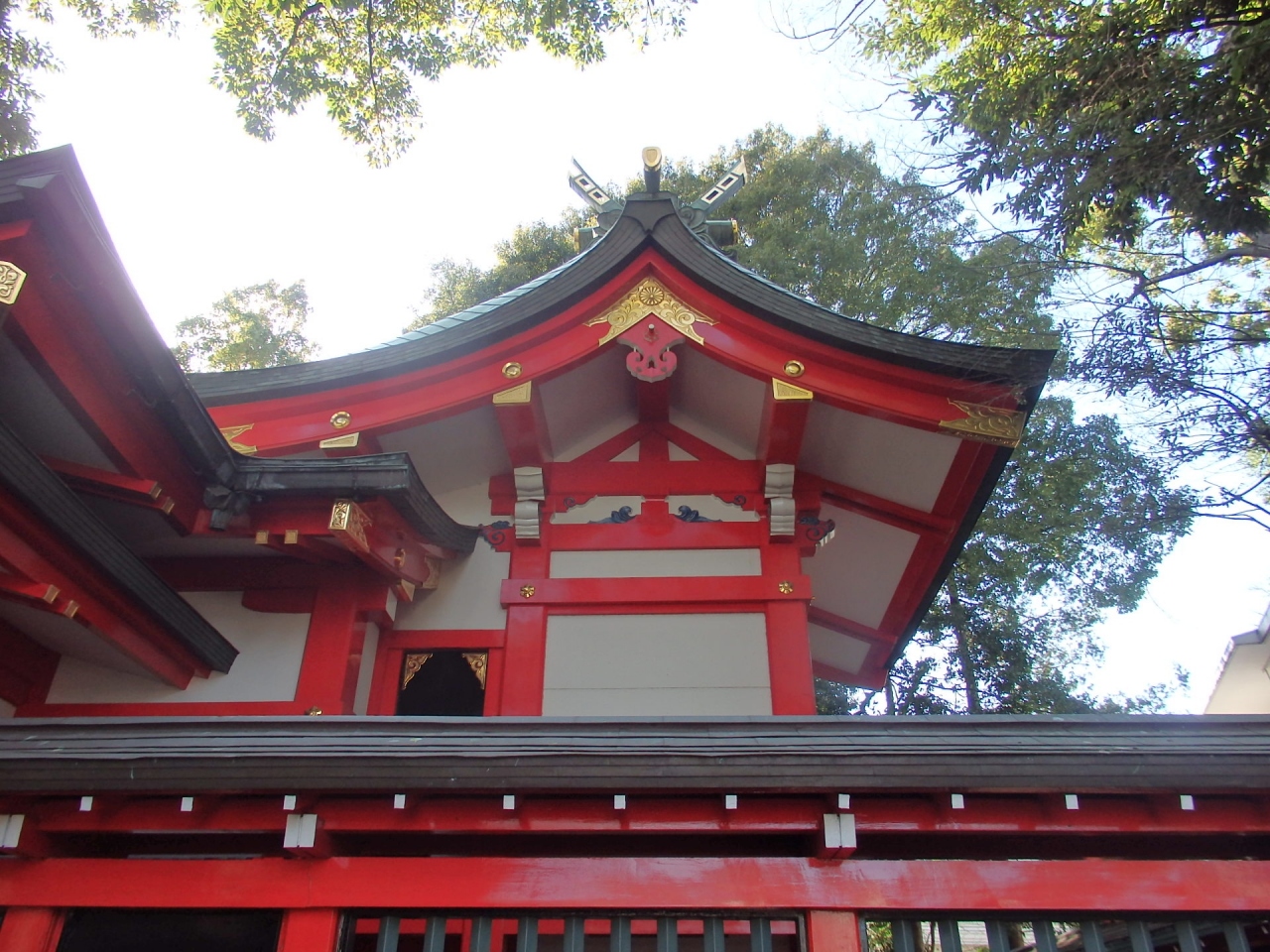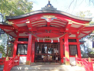 東急世田谷線松原駅より徒歩1分ぐらいのところにあります。十六世紀末創建で、御祭神は大国魂命です。住宅街の中にあり、鳥居を潜り、左に手水、境内社の厳島神社、漫画家杉浦幸雄氏が描いた天宇受売る命の碑、正面に拝殿、本殿があるこじんまりした神社です。昭和44年に造営された鮮やかな赤い社殿が目を引きます。紅梅は咲き始めたところでした。神社運営の幼稚園があり、境内では園児たちがにぎやかに遊んでいました