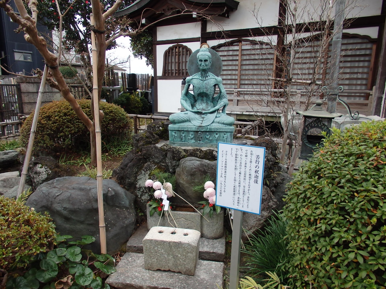ると六地蔵があり、正面に本堂があります。本堂左手前には苦行の釈迦像があり、悟りを開く前後のお釈迦様を表わした像で初めて見ました。普段みかける柔和なお顔の仏様と異なり違和感があります。こじんまりしたお寺ですが割と重厚な藥医門と大きな本堂には目を見張ります。人通りの多い蔵造の街並みから一本西の道沿いにあるお寺ですが、ここも蔵造の街並みの喧騒さに比べひっそりとしていて出会った参拝客は3人でした。ゆっくりと参拝・見学ができました