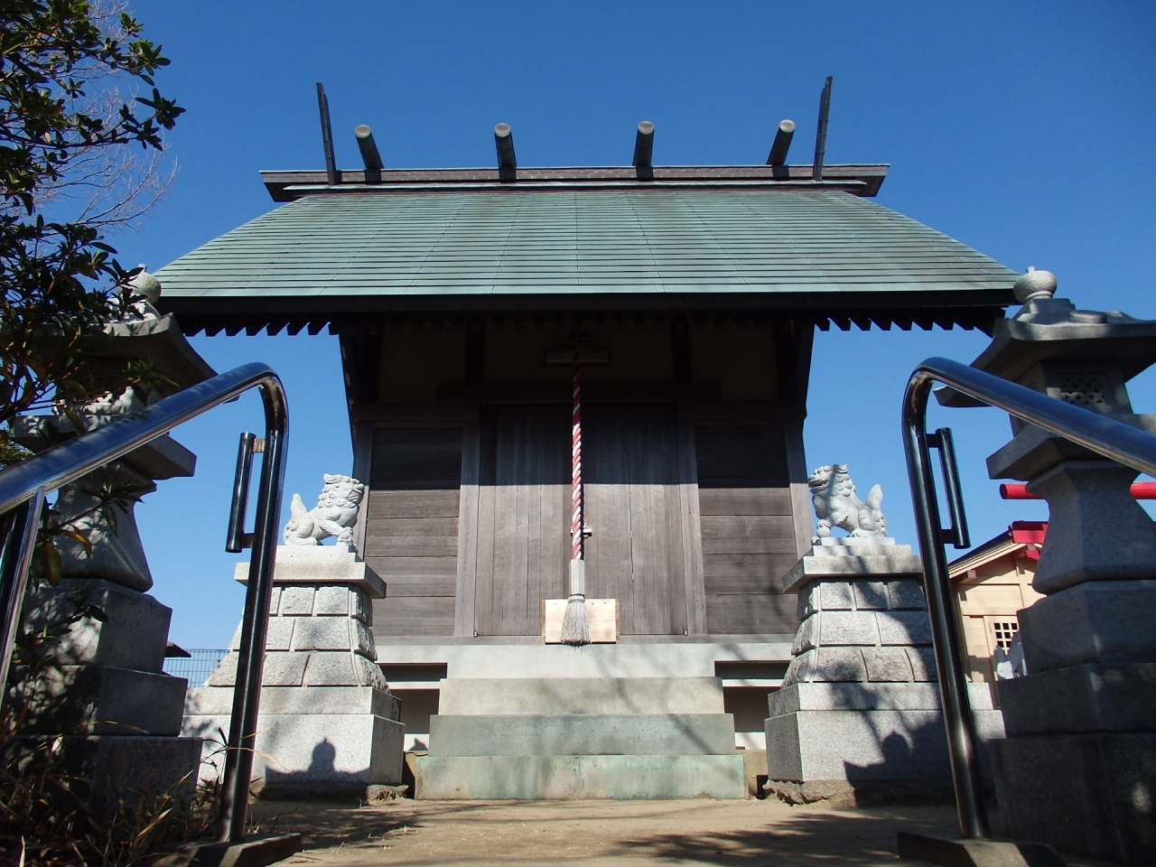 創建は1650年、ご祭神天照大御神です。鳥居をくぐり急な石段を登ると二匹の狛犬と社殿があります。小さな境内には境内社稲荷神社と大黒天像(藤沢七福神)、石の祠がありました。石段側から登った時は深閑とした神社を思わせますが、長い石段を登った先の社殿のある所は新興住宅団地のど真ん中、すごいギャップを感じさせられました