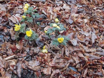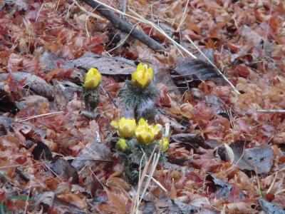 山腹駐車場までレンタバスで入り、山腹登山口から登り始め、30分弱で福寿草園に到着しました。福寿草は3cmほどの黄色も花です。残念ながら10株ほどしか見つけることができませんでした。駐車場におられた町の人は「今年は雨が少なかったので福寿草の花数は大変少ない」と言っていました。10株見られただけでも満足と思わざるをえません。またいつか、来て見たいものです