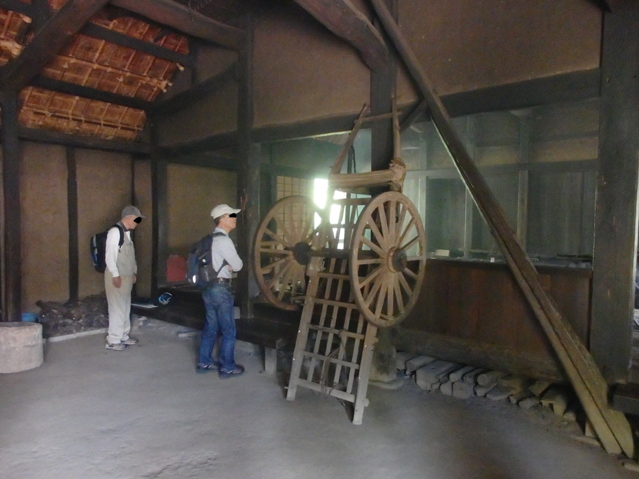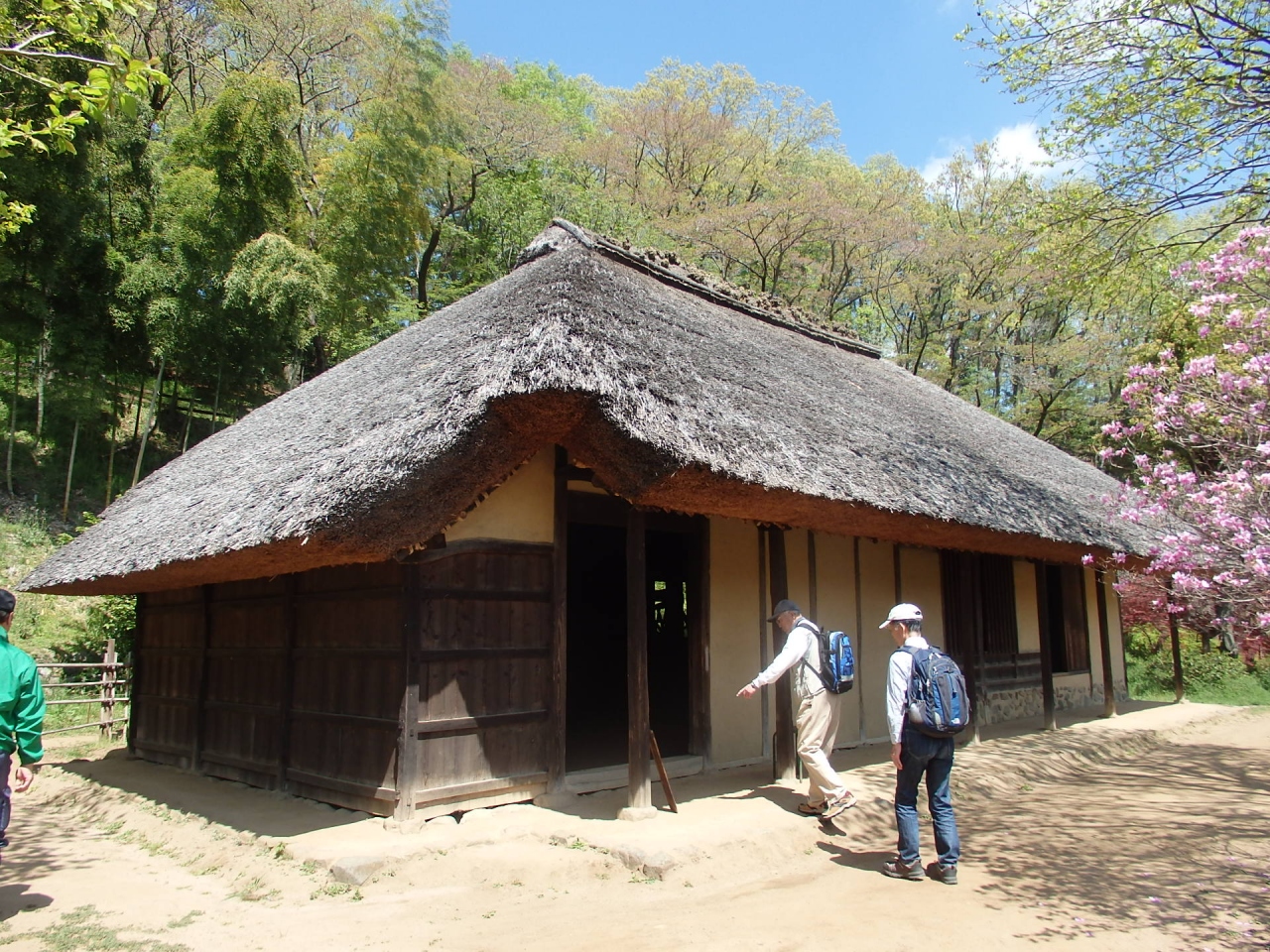 薬師池公園の中に旧永井家住宅があります。市内にあった茅葺寄棟造りの古民家を園内に移築したものです。都内最古のもので国指定重要文化財になっています。永井家の方は先ほどの荻野家住宅(妻側に入口がある)と異なり、平側に入口があります。よく見かける古民家です。屋根も荻野家は入母屋造りで、永井家と異なります。床に竹の簀の子が使用されている部屋を始めて見ました。丁度、虫・動物除けの燻す作業が行われていました。2軒の異なる古民家が見られ、勉強になりました