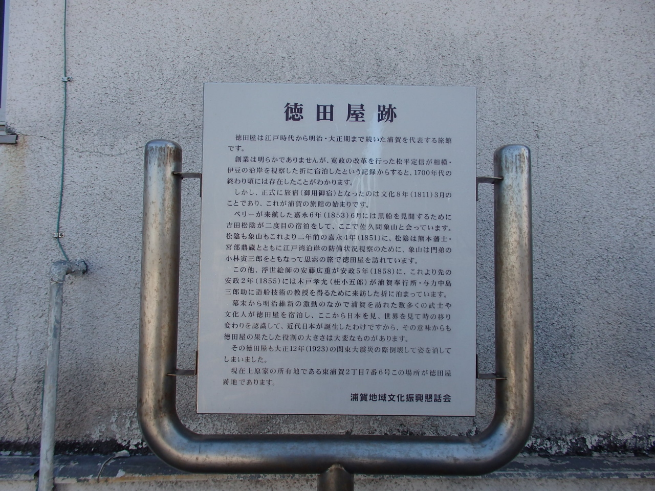 渡し船の東浦賀の発着場を降りたところの直ぐ先にあります。江戸湾防衛の最前線となって、多くの商人、文化人、武士が訪れるようになり、その宿泊施設が必要になりました。幕府公認の浦賀で建てられた初めての旅館で、吉田松陰、佐久間象山、桂小五郎、安藤広重等歴史上有名な人物が泊っていてびっくりしました。さすが黒船来航の最先端ですね。創建当時の建屋は関東大震災で倒壊してしまい、現在は個人所有の建物が建てられています