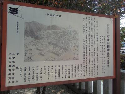 現在武田神社あるところに武田氏の平時の城、躑躅ケ崎館がありました。武田信虎、信玄、勝頼三代の館跡です。神社のところが、館の主曲輪部です。大手門跡を東に出ると、惣堀、土塁、石塁、虎口、石段、土橋、厩跡等が復元されている(一部は当時のもの)ものが見られます。その他、信玄公御使用の井戸、西曲輪北側の枡形門跡(2つの門を直行させた構え)が見られます。大手門にある南側にある深い水堀、北側にある深い空堀、および大手門前方にあった馬出(今は無い三日月堀のあった時代)、北側にある枡形門等、平時の城であってもかなり堅固な城構えを備えていたものと想像されます。お城ファンにはお勧めのスポットです