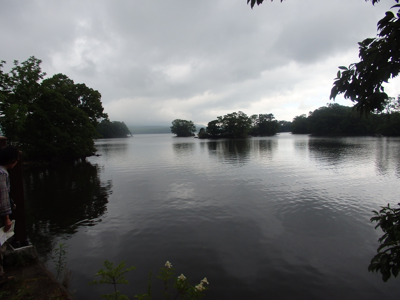 蝦夷駒ケ岳登山を途中、雨と濃霧により、登山をあきらめ引き返す。午後は自由行動となり、大沼湖を散策する。大沼湖は蝦夷駒ケ岳の火山活動でできた湖で大小81個の島があります。島巡りの路、大島の路、森の路の3つの散策コースがります。島と島を橋で繋いだ周遊コースになっています。雨は上がりましたが、雲が厚く、素晴らしいと想像される風景が冴えません。曇っているので、駒ケ岳も見えません。「千の風になって」名曲生誕の碑がありました。花はスイレンとハマナスのみでした。駒ケ岳は雨と霧のため途中で引返す、大沼国定公園も曇りで芳しくなく、花も少なく、気分が晴れない一日でした