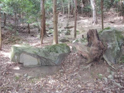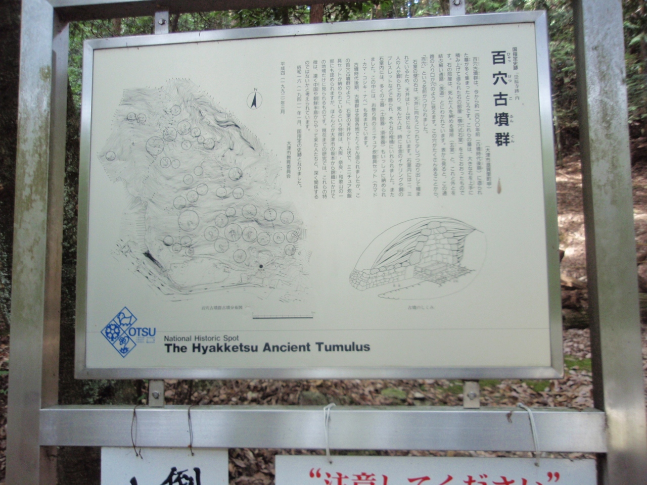 六世紀~七世紀にかけての渡来人の墓と言われています。一見したところ、覆っていた土が流れ出し、むき出しになった大きな岩がごろごろしているという感じですが、その中に横穴式石室(円墳)を数個見ることができました。古墳は斜面にあり、石室の入口が穴のように多く見えるところから名付けられました。薄暗い竹林の中にあるためか、ちょっと身震いする感じのさびしい場所です。生憎懐中電灯を持っていなかったので、中は暗くてよく見えませんでした。古墳見学の時には懐中電灯が必須です
