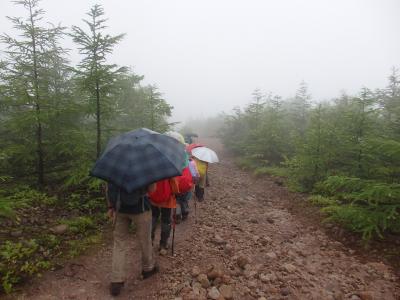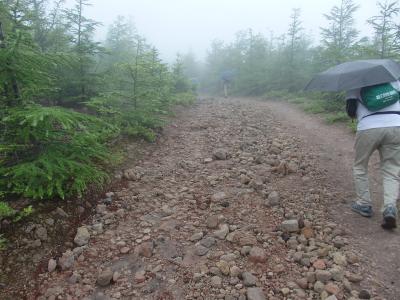 前泊した民宿ゆっくり大沼よりレンタカーで登山口のある駒ケ岳自然休養林六合目駐車場に向かう(所要30分)。現在蝦夷駒ケ岳山頂は入山禁止で馬の背までとなっている。登山口から登り始め、途中雨が強くなり傘をさして砂礫の登山道を緩やかに登る。登り始めて40分程のところで相談して、雨と濃霧により、登山をあきらめここで引き返す。一昨日のイワオヌプリ登山と同じく、天気に恵まれない山行でした。野花もほとんど見当たらず、大変残念な山行でした