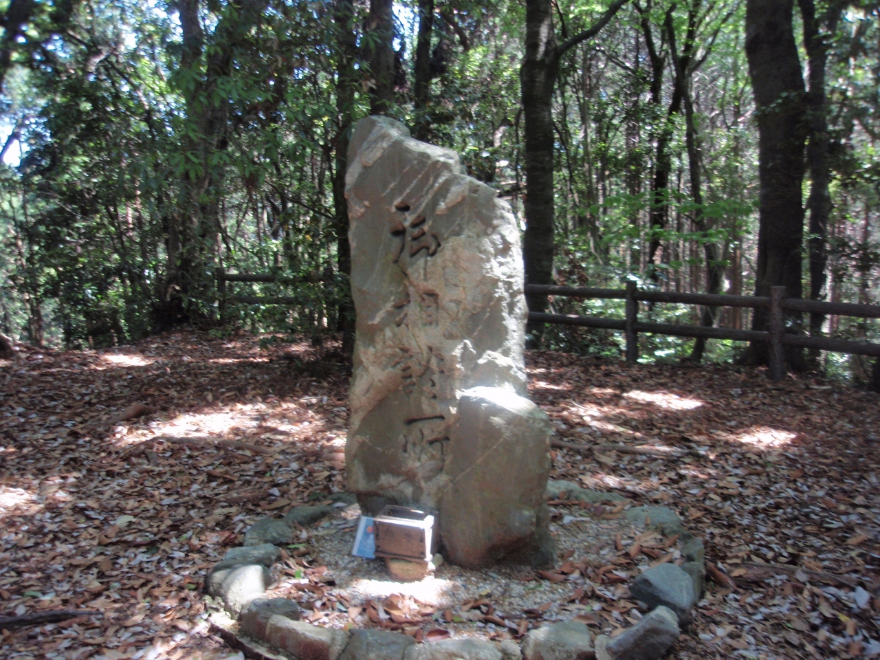 談山神社が有する多くの国重文建造物や拝殿内の文化財展示物を見た後、権殿左側にある御破裂山登山口から登り始めました。割と急な登り道を10分ほど登ると談山山頂(566M)があります。展望はありません。藤原鎌足と中大兄皇子が大化改新を談らいあった場所であり、御相談所という碑が立っています。来た道を戻り、分岐を直進する。少し急な登りまたは平坦な道を2回繰り返す。10分強で御破裂山山頂(618M)に到着します。山頂には鳥居が建っており石柱で囲まれた藤原鎌足の墓があります。このあと石舞台に向かいました。本日のコースは登山より、七世紀の歴史や寺社拝観を楽しむことを目的とするコースです。歴史や寺社に興味を持つ人にお勧めのコースです